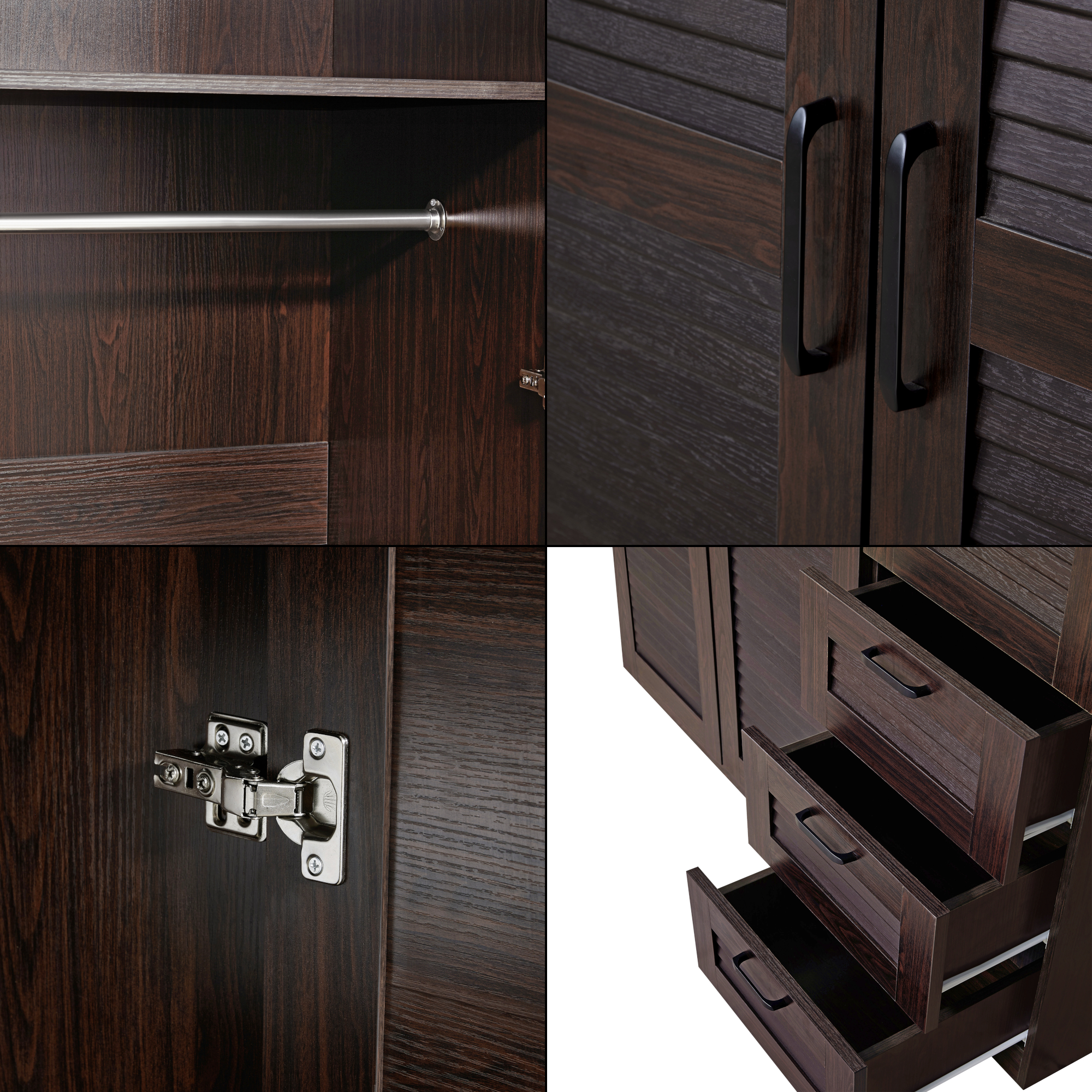 Interiorul este gândit pentru depozitare clară și acces rapid la lucrurile de zi cu zi. Dispune de o bară pentru umerașe, patru rafturi interioare și trei sertare, astfel încât să poți separa hainele pe categorii și să menții ordinea mai ușor.