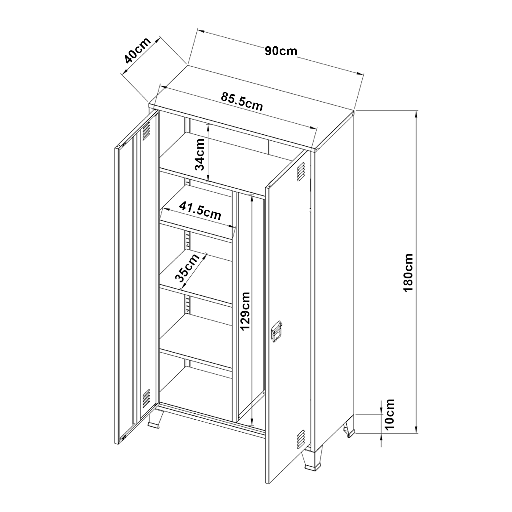Interiorul este gândit practic pentru depozitare variată: dispune de bară pentru haine, un raft superior generos și trei rafturi reglabile pe înălțime, ideale pentru tricouri, cutii, prosoape sau încălțăminte. Ușile cu fante de aerisire contribuie la o mai bună ventilare a spațiului interior, iar suprafața din oțel se curăță rapid și ușor.