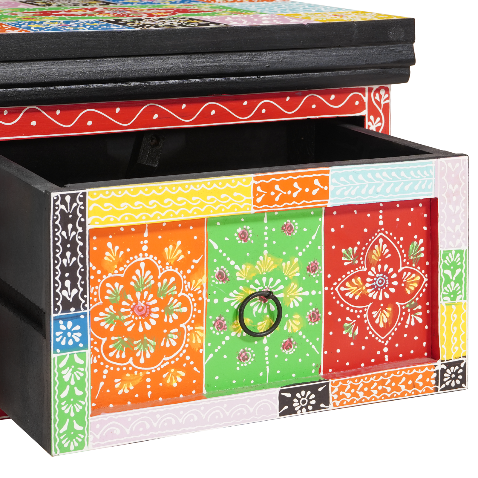 - Caracteristici / Funcție / Design: Designul distinctiv, vopsit manual, adaugă o vibrație energizantă care face ca room-ul tău să fie plin de viață. Modelele geometrice unice subliniază spiritul boem, asigurându-se că nu e doar un simplu mobel, ci un centru creativ care îți stimulează propriul flair decorativ.