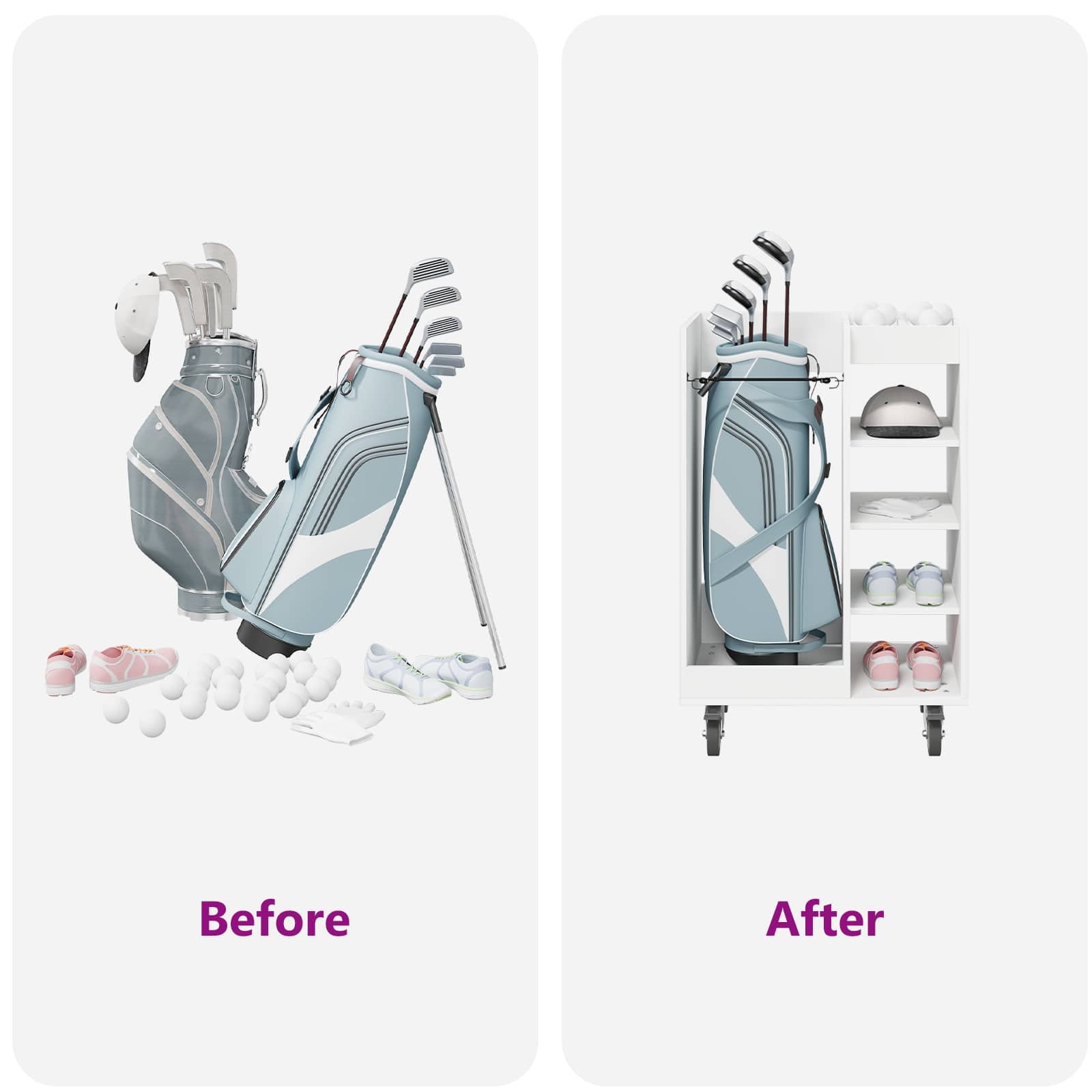 - Caracteristici / Funcționalitate / Design: E creat cu multe opțiuni pentru stocare, inclusiv rafturi potrivite pentru echipamentul de golf. Designul lui ascunde discret conținutul, iar stilul modern se potrivește cu orice decor. E perfect pentru a menține ordinea și a arăta bine.