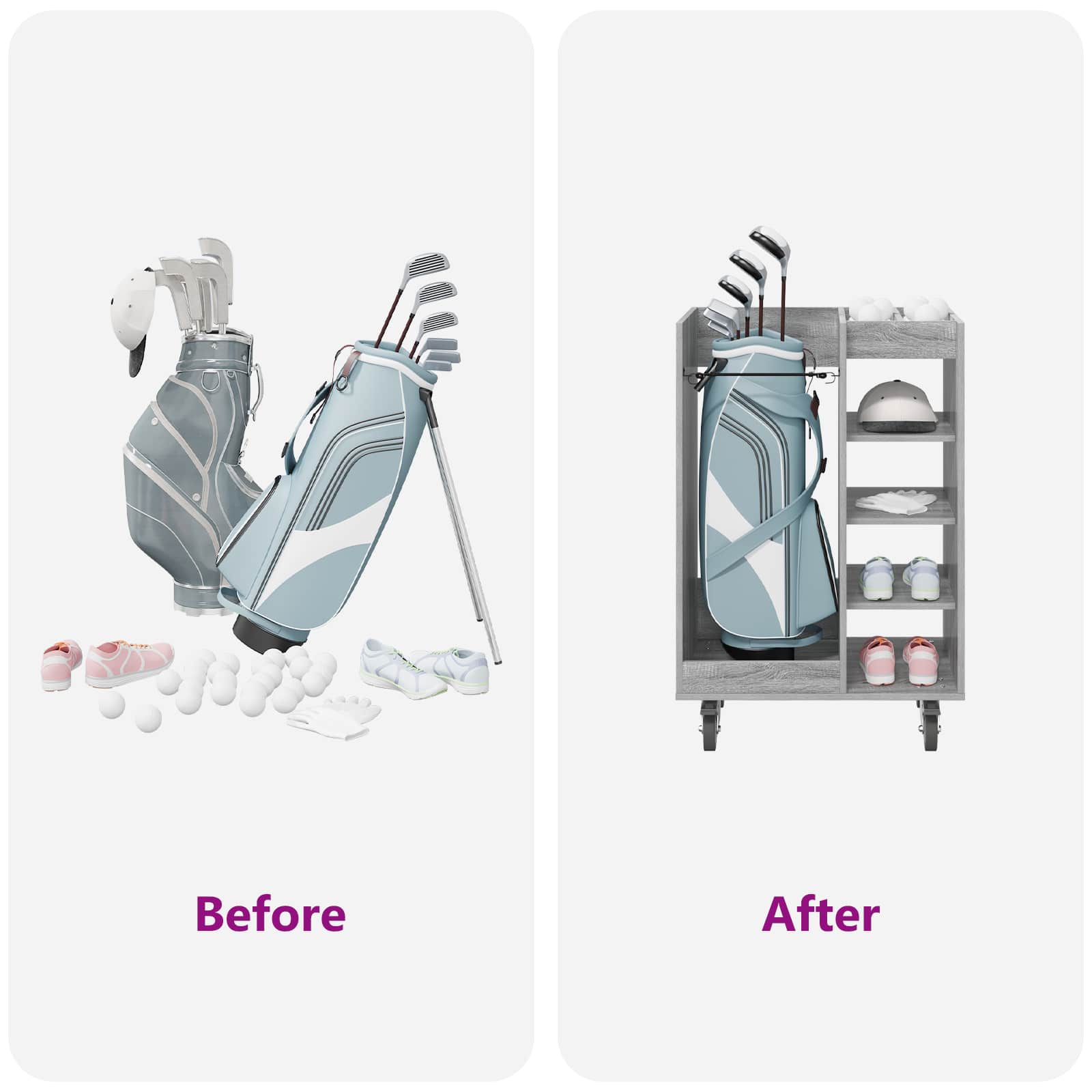 - Caracteristici / Funcționalitate / Design: E creat cu multe opțiuni pentru stocare, inclusiv rafturi potrivite pentru echipamentul de golf. Designul lui ascunde discret conținutul, iar stilul modern se potrivește cu orice decor. E perfect pentru a menține ordinea și a arăta bine.