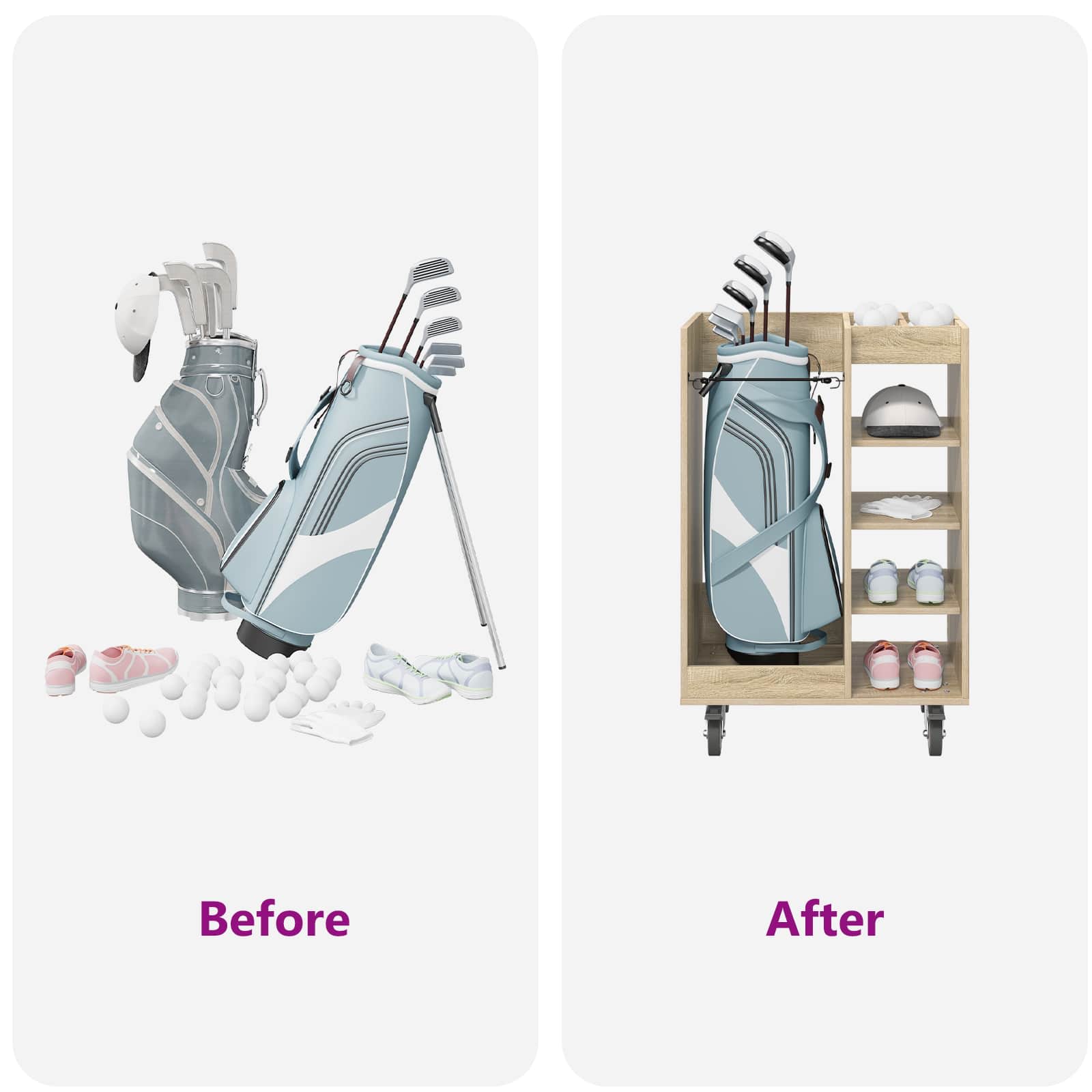 - Caracteristici / Funcționalitate / Design: E creat cu multe opțiuni pentru stocare, inclusiv rafturi potrivite pentru echipamentul de golf. Designul lui ascunde discret conținutul, iar stilul modern se potrivește cu orice decor. E perfect pentru a menține ordinea și a arăta bine.