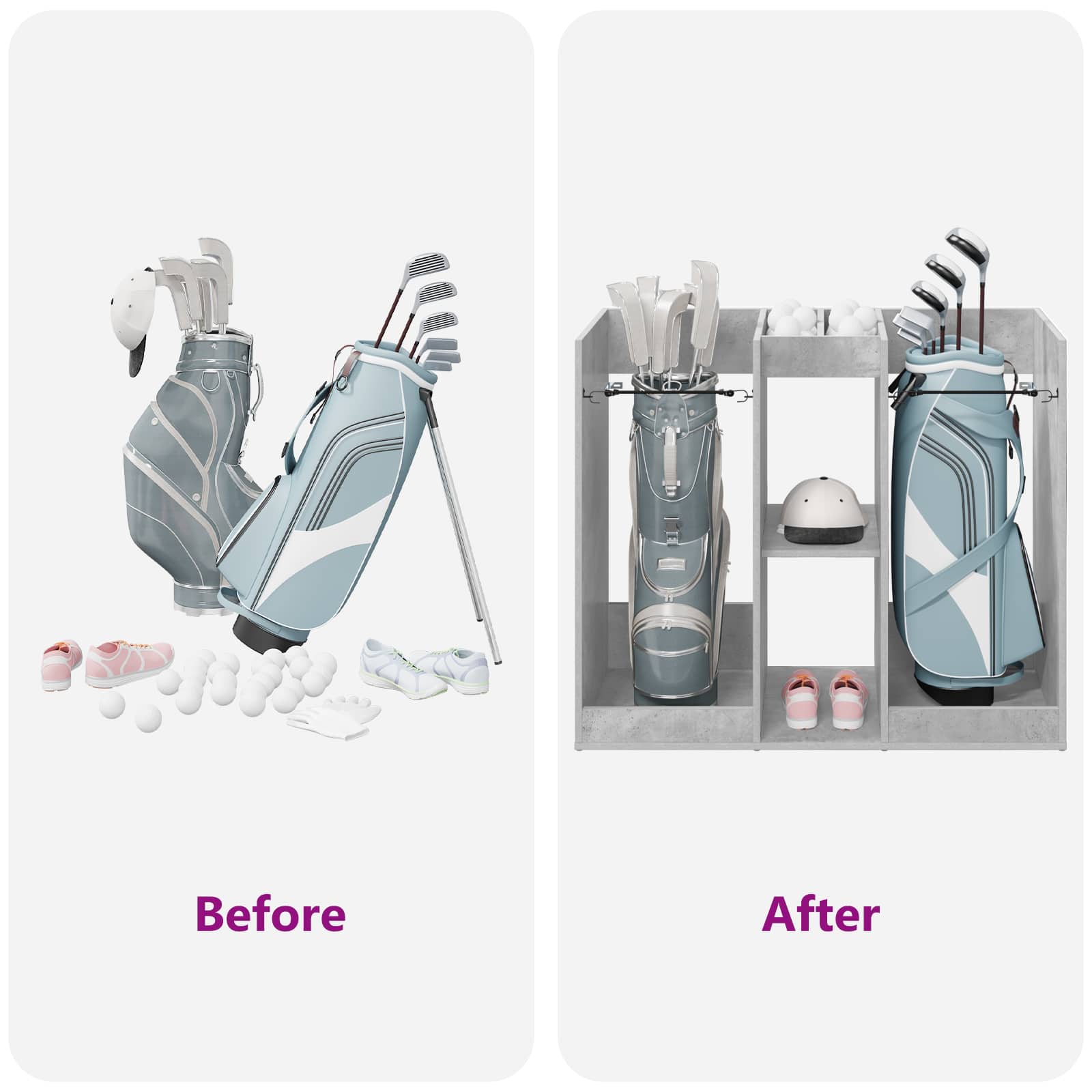 - Utilizări recomandate: Ideal pentru garaje sau orice spațiu în care ai nevoie de un loc unde să pui lucruri. E perfect pentru echipamentele de golf sau alte articole și se integrează natural în camere cu stil modern. Se poate folosi în diverse scopuri, fie că e vorba de sport sau de organizarea casei.