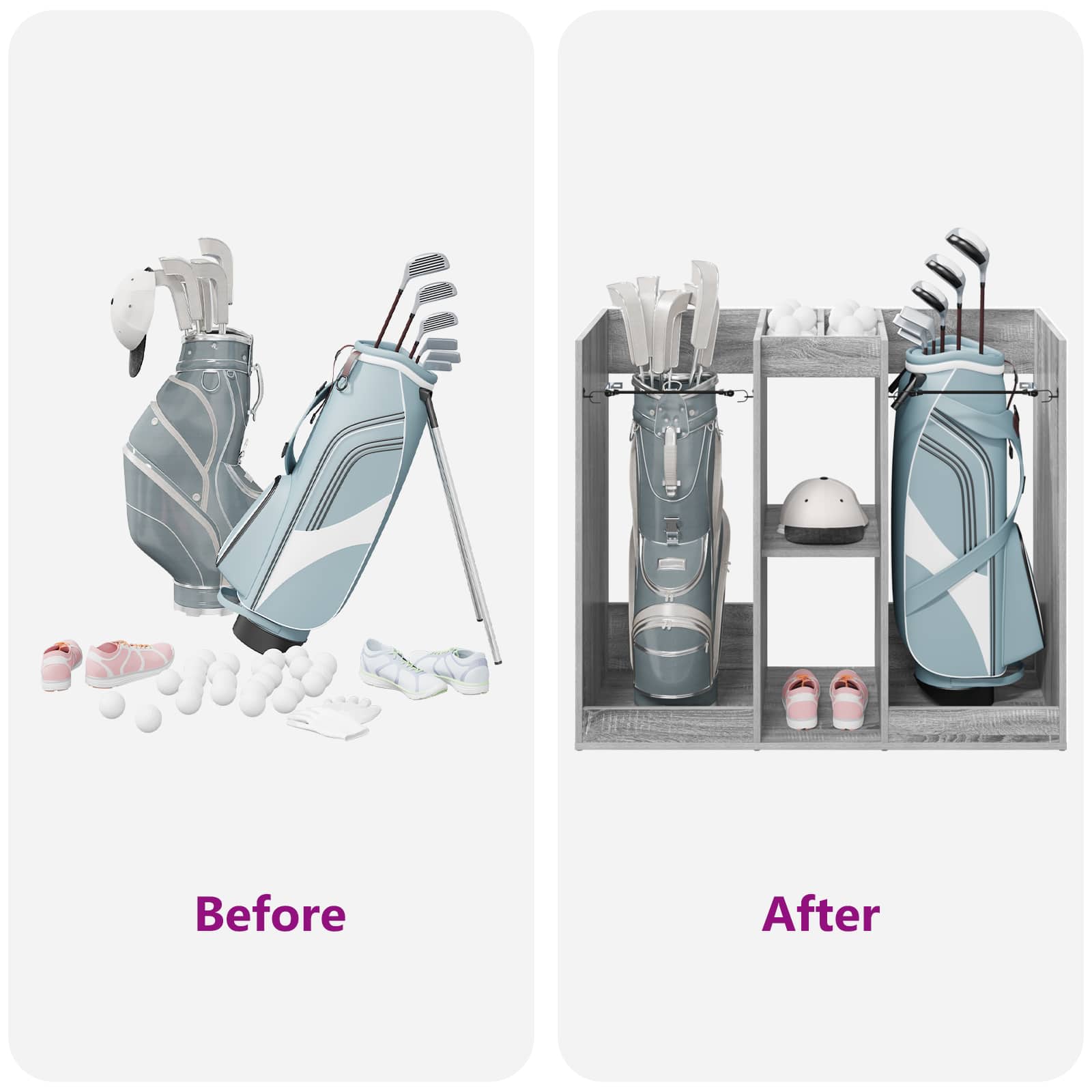 - Caracteristici / Funcționalitate / Design: E creat cu multe opțiuni pentru stocare, inclusiv rafturi potrivite pentru echipamentul de golf. Designul lui ascunde discret conținutul, iar stilul modern se potrivește cu orice decor. E perfect pentru a menține ordinea și a arăta bine.