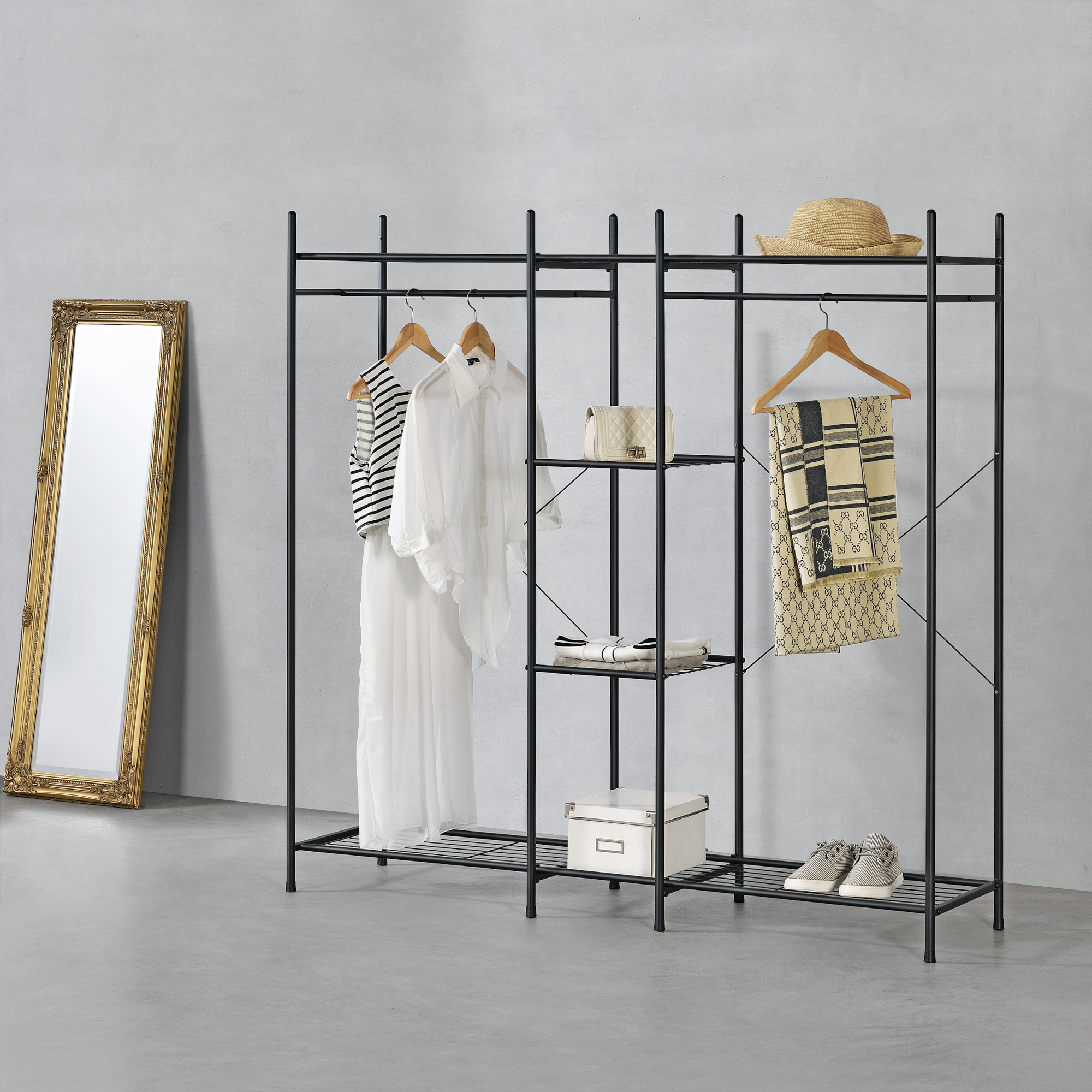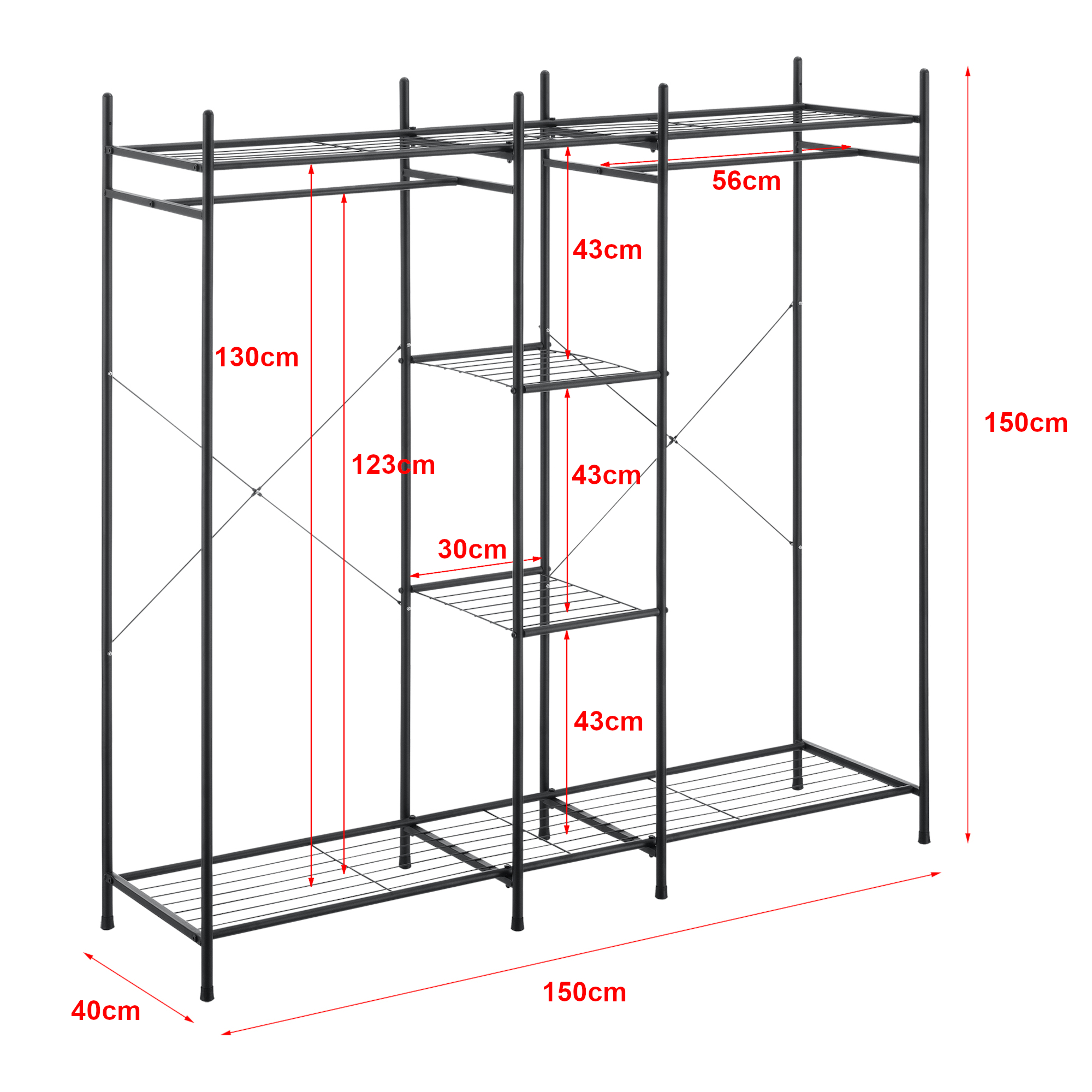 Acest suport pentru haine practic si masiv se monteaza simplu si rapid.Dulapul este prevazut cu bare pentru umerase si alte suprafete pentru depozitarea pantofilor de exemplu sau a altor lucruri.