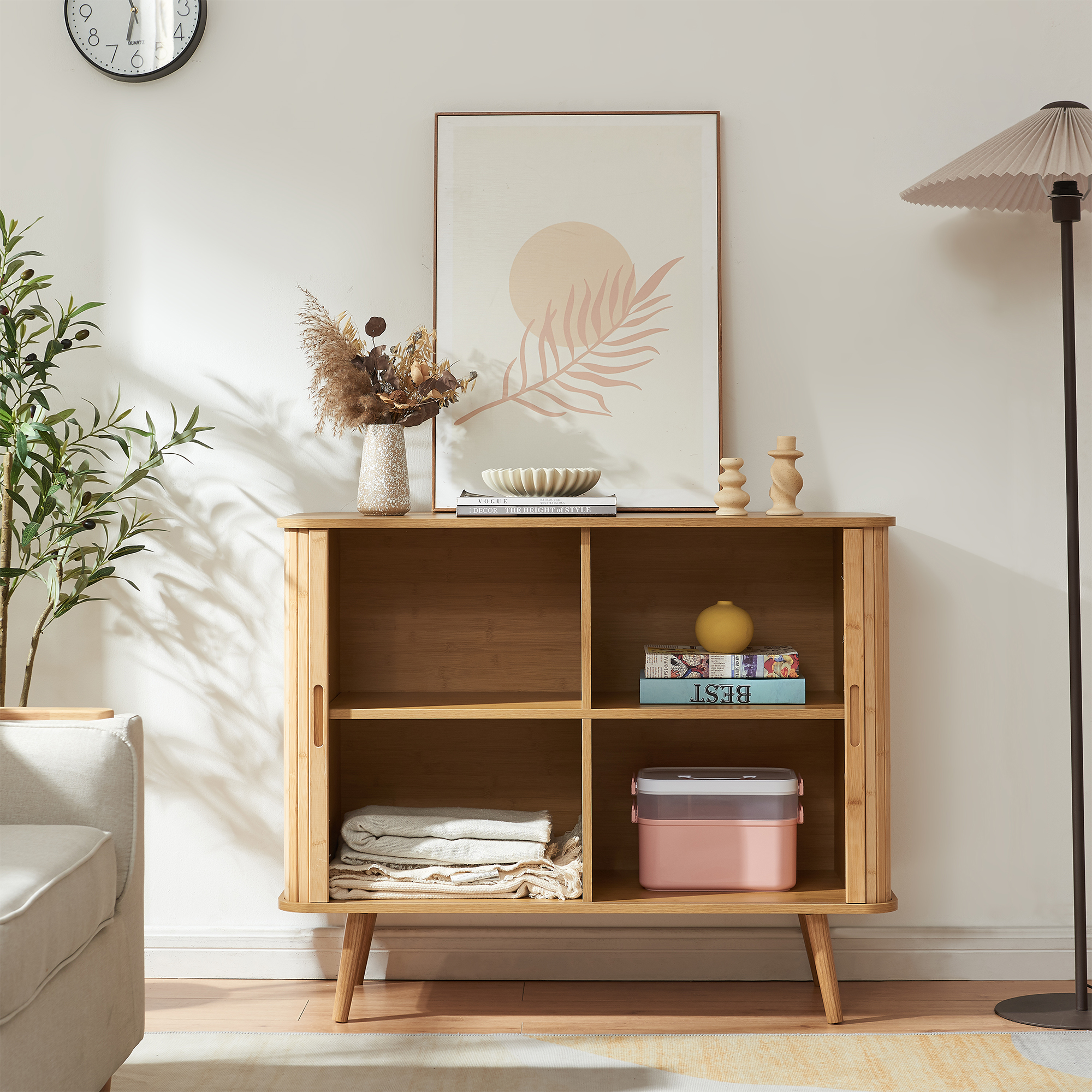 Acest dulap din bambus este ideal pentru depozitarea obiectelor din living, pentru organizarea textilelor și accesoriilor în dormitor sau pentru păstrarea obiectelor necesare în hol. Blatul superior poate fi folosit pentru decorațiuni, lămpi sau cărți, completând funcțional amenajarea.