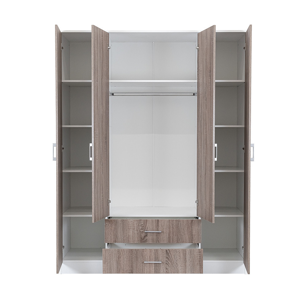 Interiorul este gandit pentru organizare rapida: ai 11 rafturi pentru plieri, cutii si lenjerii, plus 2 sertare pe roti pentru articole mici. Zona cu bara pentru umerase pastreaza camasile si sacourile fara sifonare, iar manerele cu efect cromat mat completeaza designul. Dulapul se livreaza demontat (plat), pentru transport si montaj mai usor.