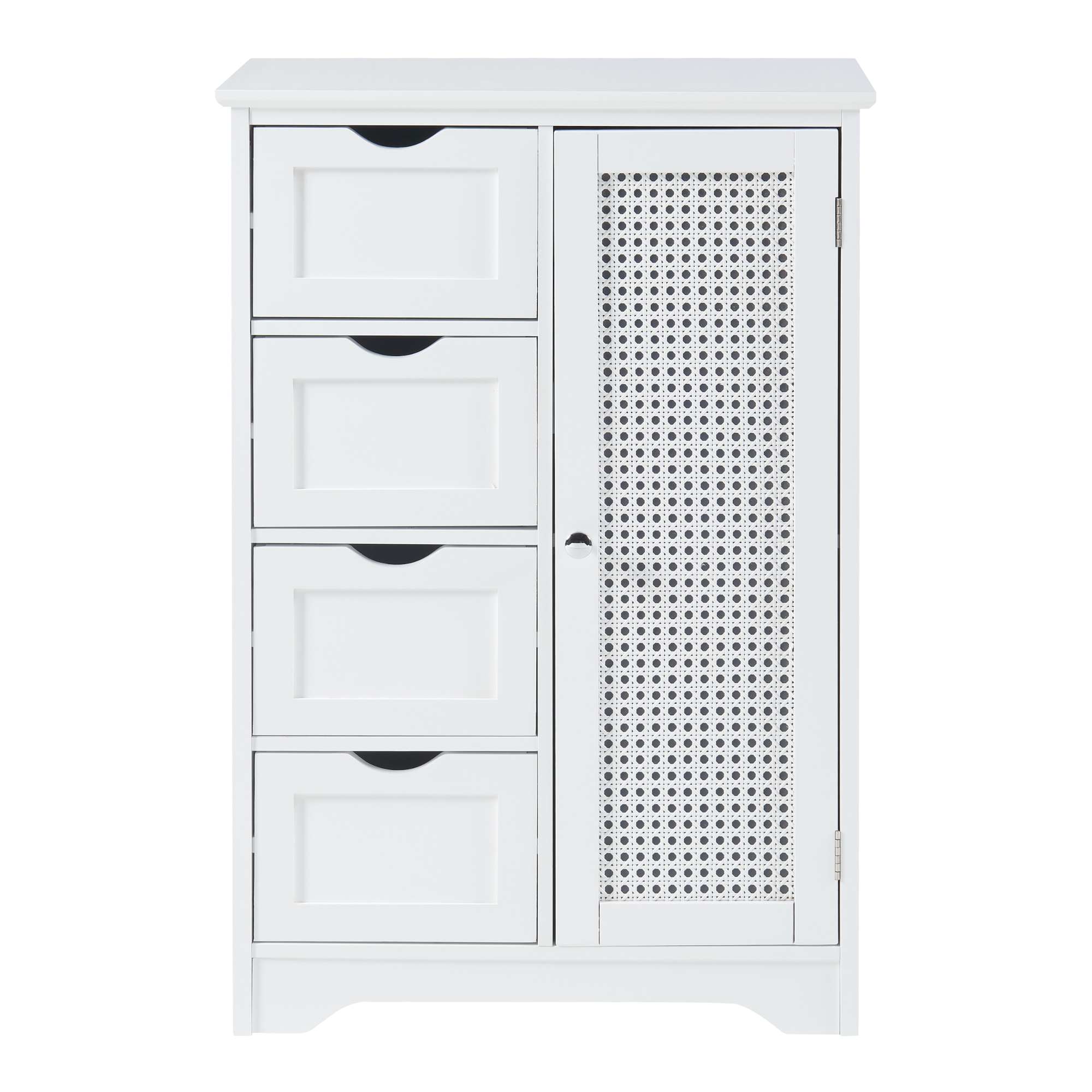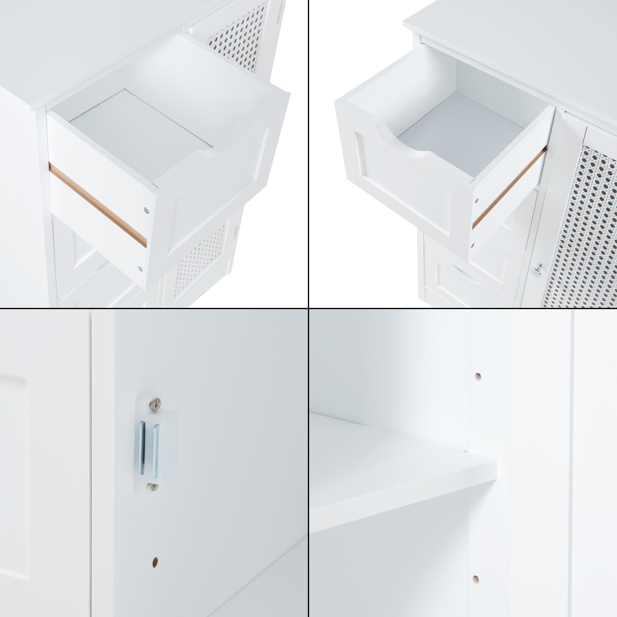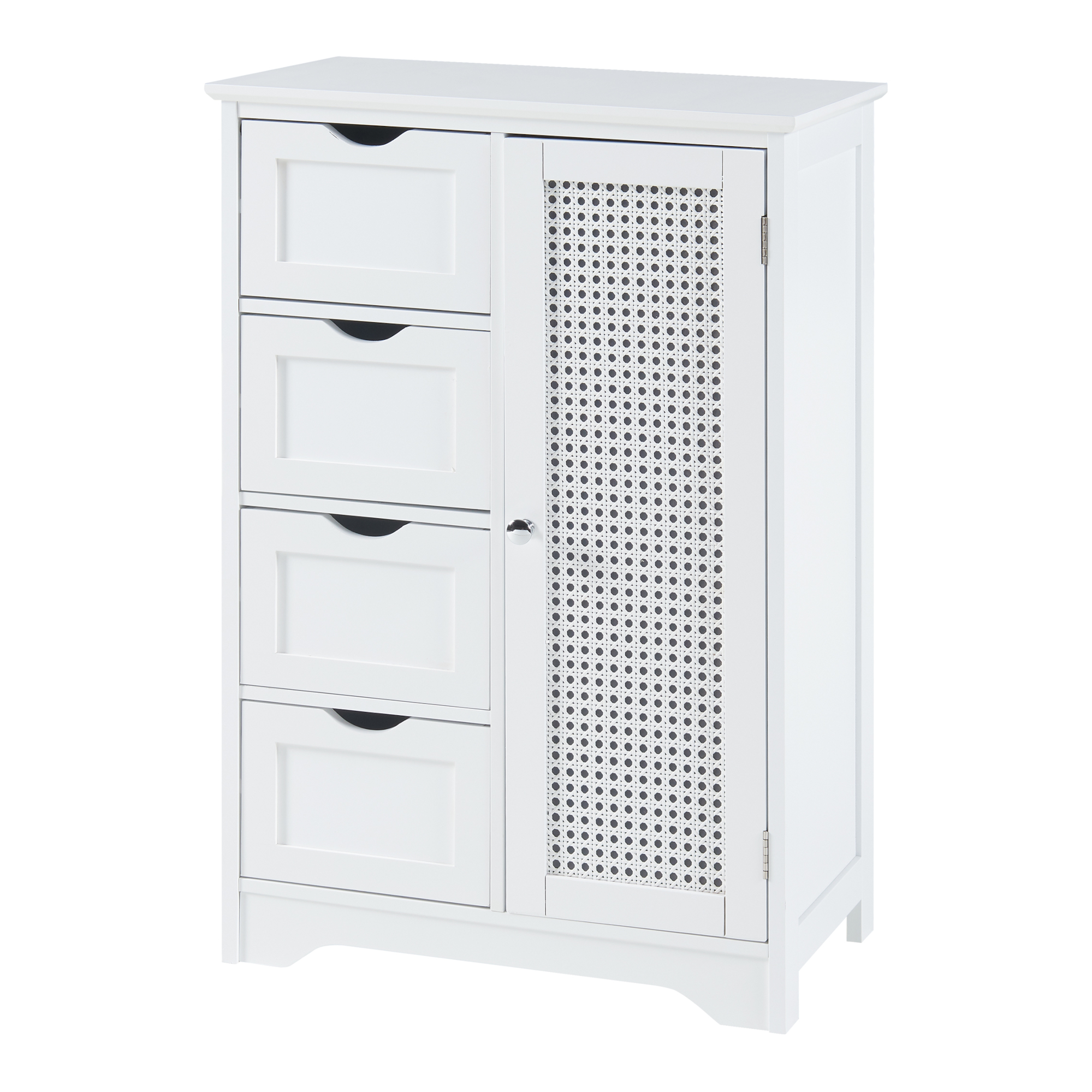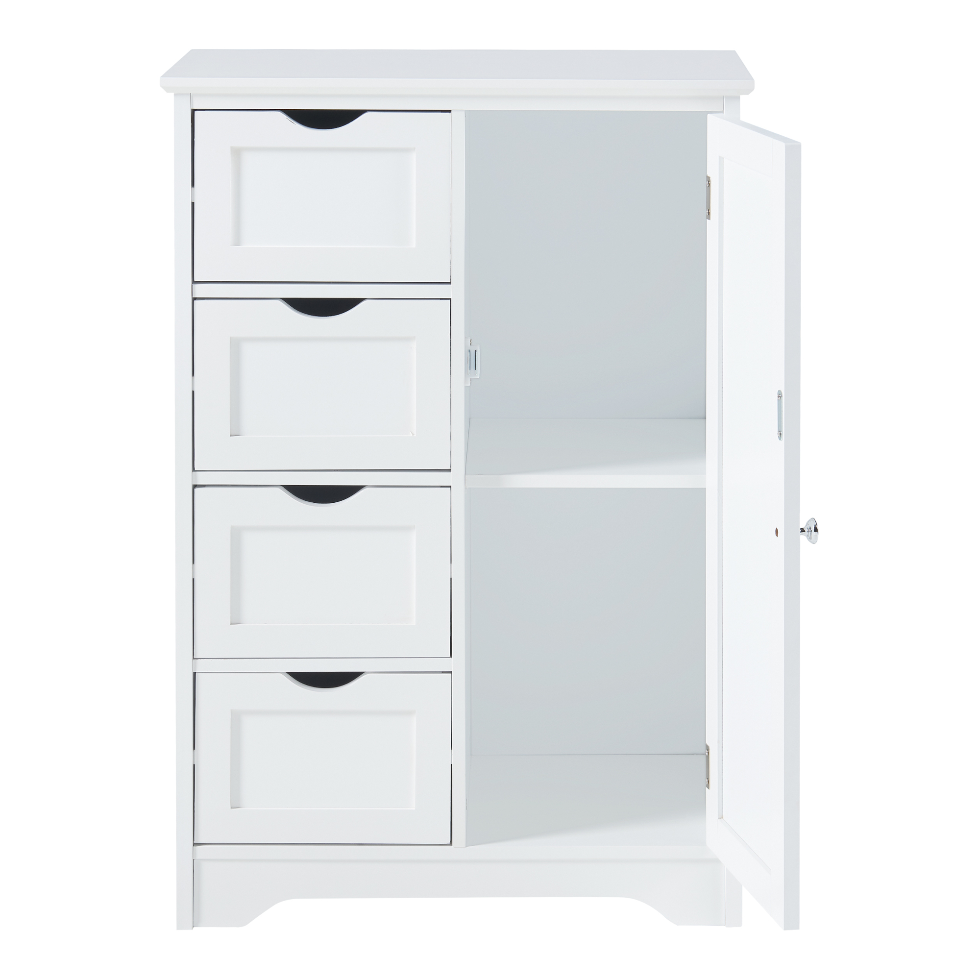 Dulapul are o usa, care se inchide si deschide usor, asigurand acces simplu la accesoriile de baie si detergenti. In cele patru sertare puteti depozita produse de ingrijire.