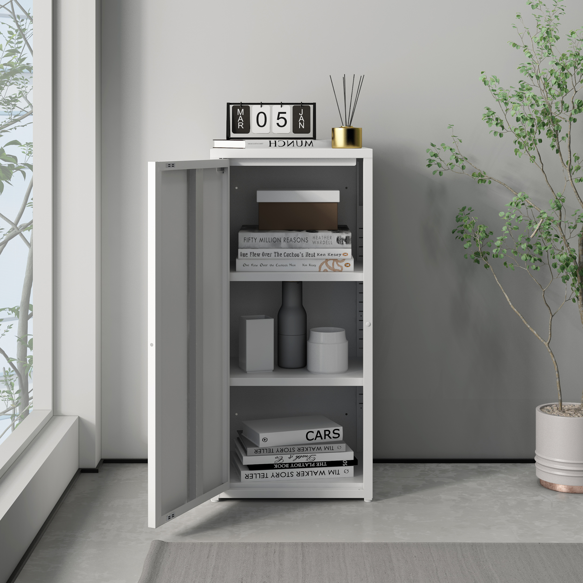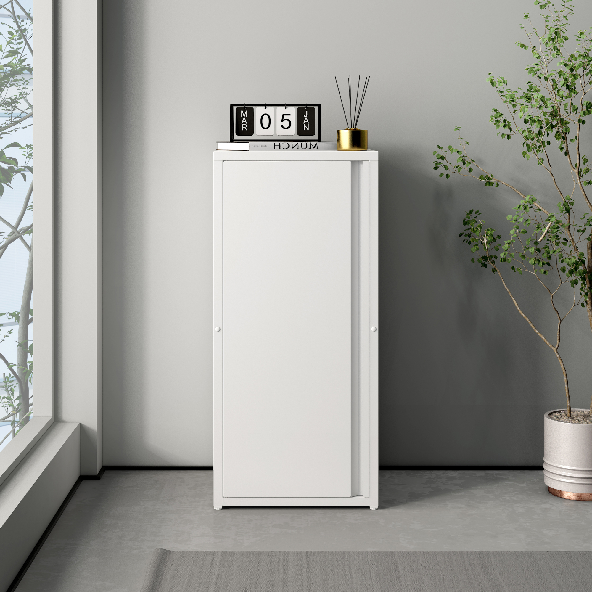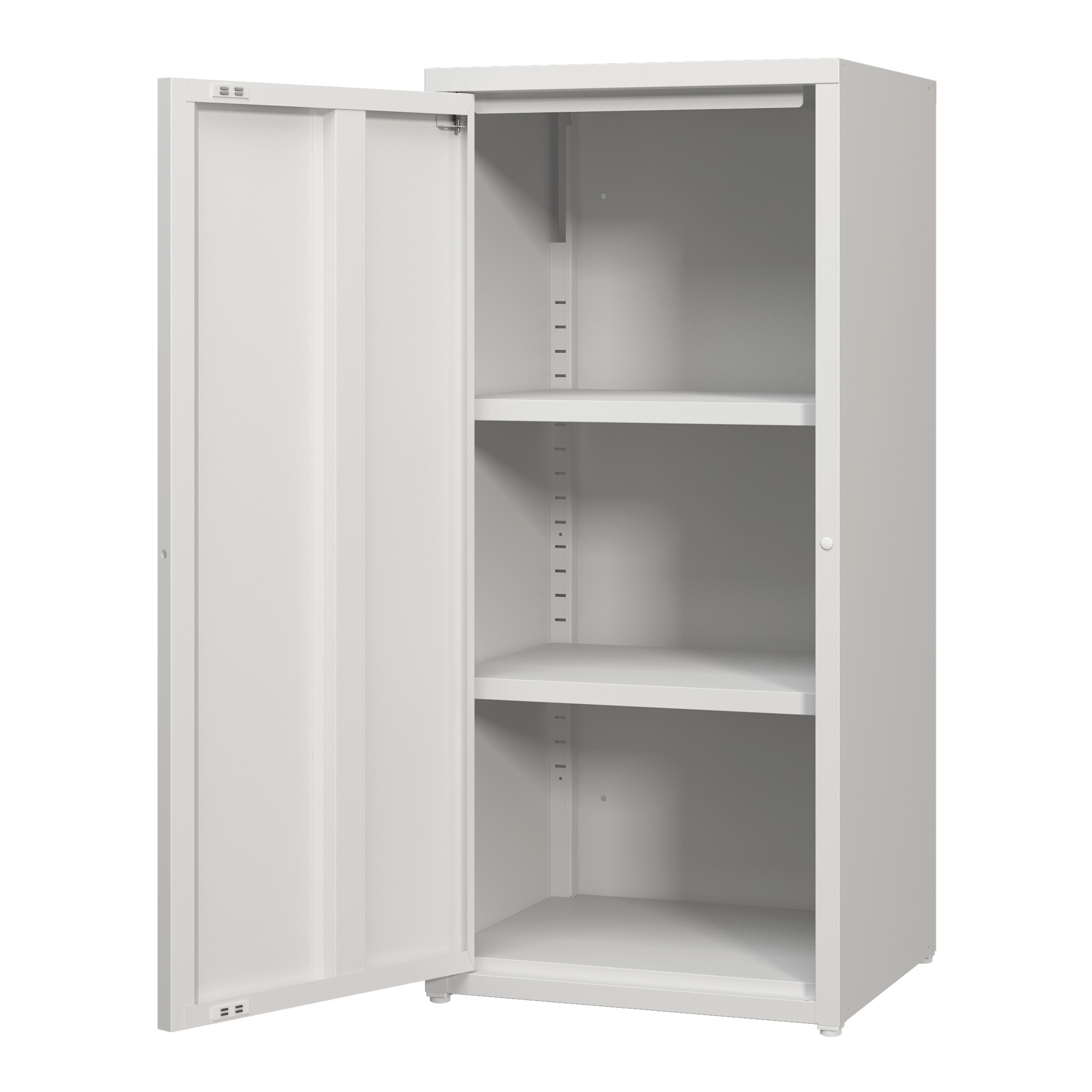 Prevăzut cu o ușă și două polițe interioare reglabile pe înălțime, acest dulap de depozitare metalic oferă flexibilitate în utilizare și se adaptează ușor nevoilor tale zilnice. Finisajul alb îi oferă un aspect curat și versatil, potrivit atât pentru spații profesionale, cât și pentru interioare moderne de acasă.