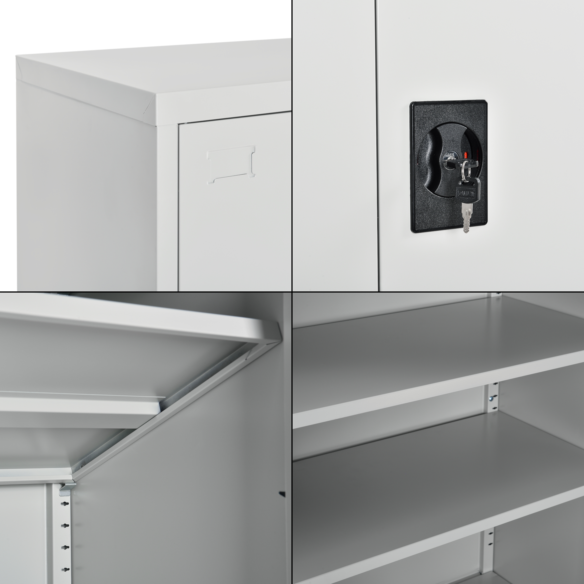 Construit din oțel vopsit în câmp electrostatic, dulapul oferă rezistență bună în utilizarea de zi cu zi și un plus de siguranță datorită sistemului de închidere cu butuc cilindric și mâner rotativ. Cele 2 polițe reglabile pe înălțime vă permit să adaptați spațiul interior în funcție de dimensiunea obiectelor depozitate.