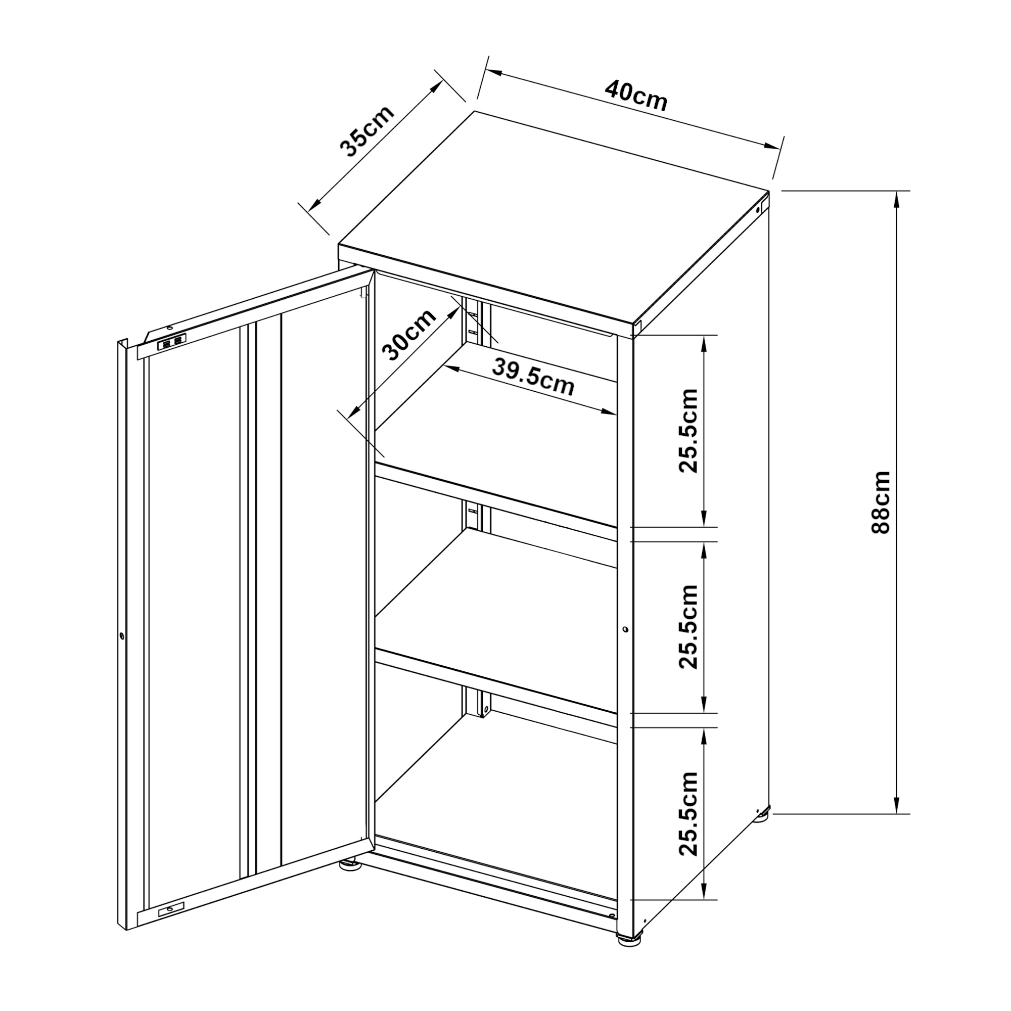 Prevăzut cu o ușă și două rafturi interioare reglabile pe înălțime, dulapul oferă flexibilitate pentru depozitarea de bibliorafturi, documente, consumabile, unelte sau diverse accesorii. Construcția din oțel contribuie la stabilitate și durabilitate în utilizarea de zi cu zi.