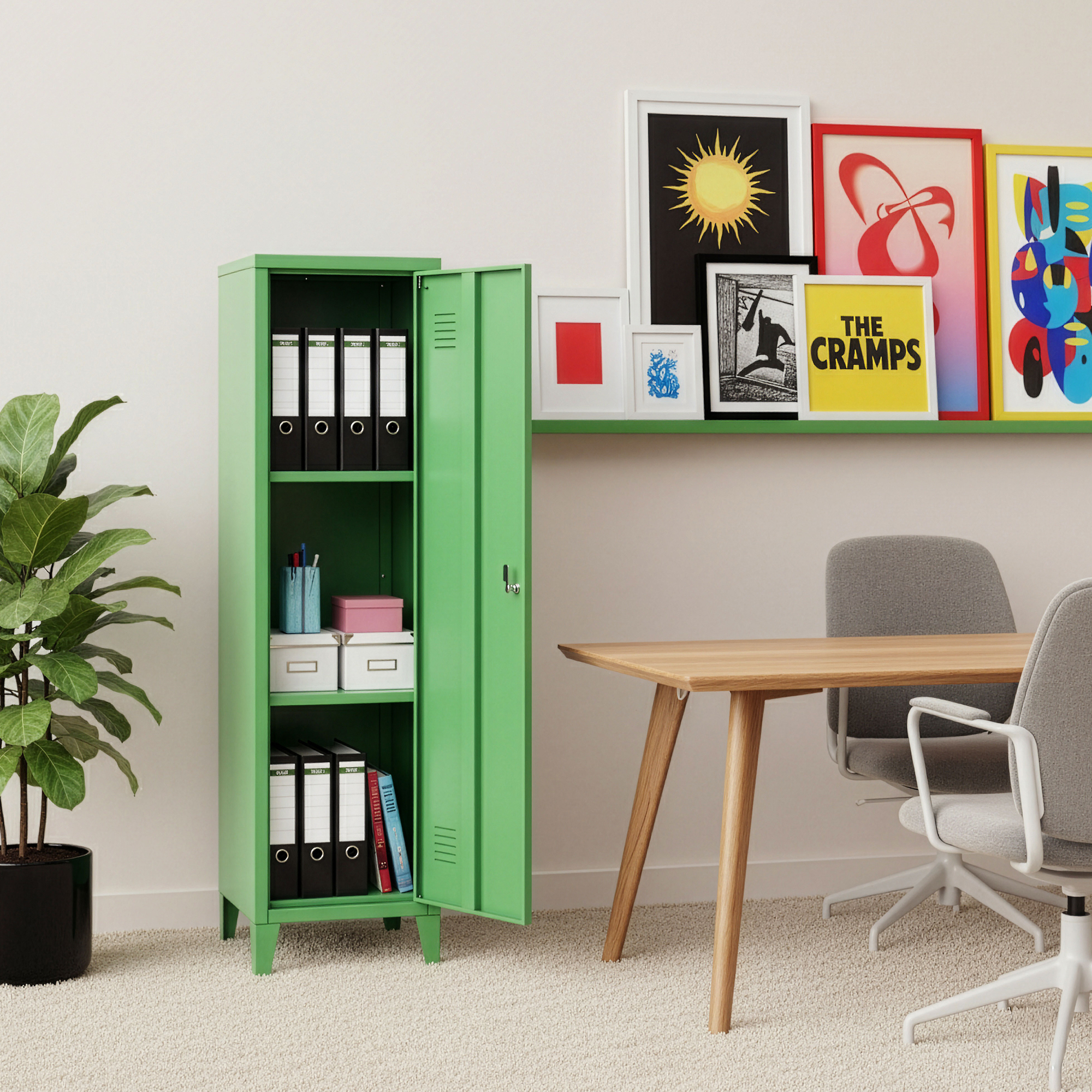 Usa este prevazuta cu inchidere magnetica, maner solid si fante de ventilatie, pentru o utilizare usoara si o circulatie eficienta a aerului in interior. In plus, dulapul este incuiabil si vine cu 2 chei, fiind o solutie practica atat pentru spatii profesionale, cat si pentru uz casnic.