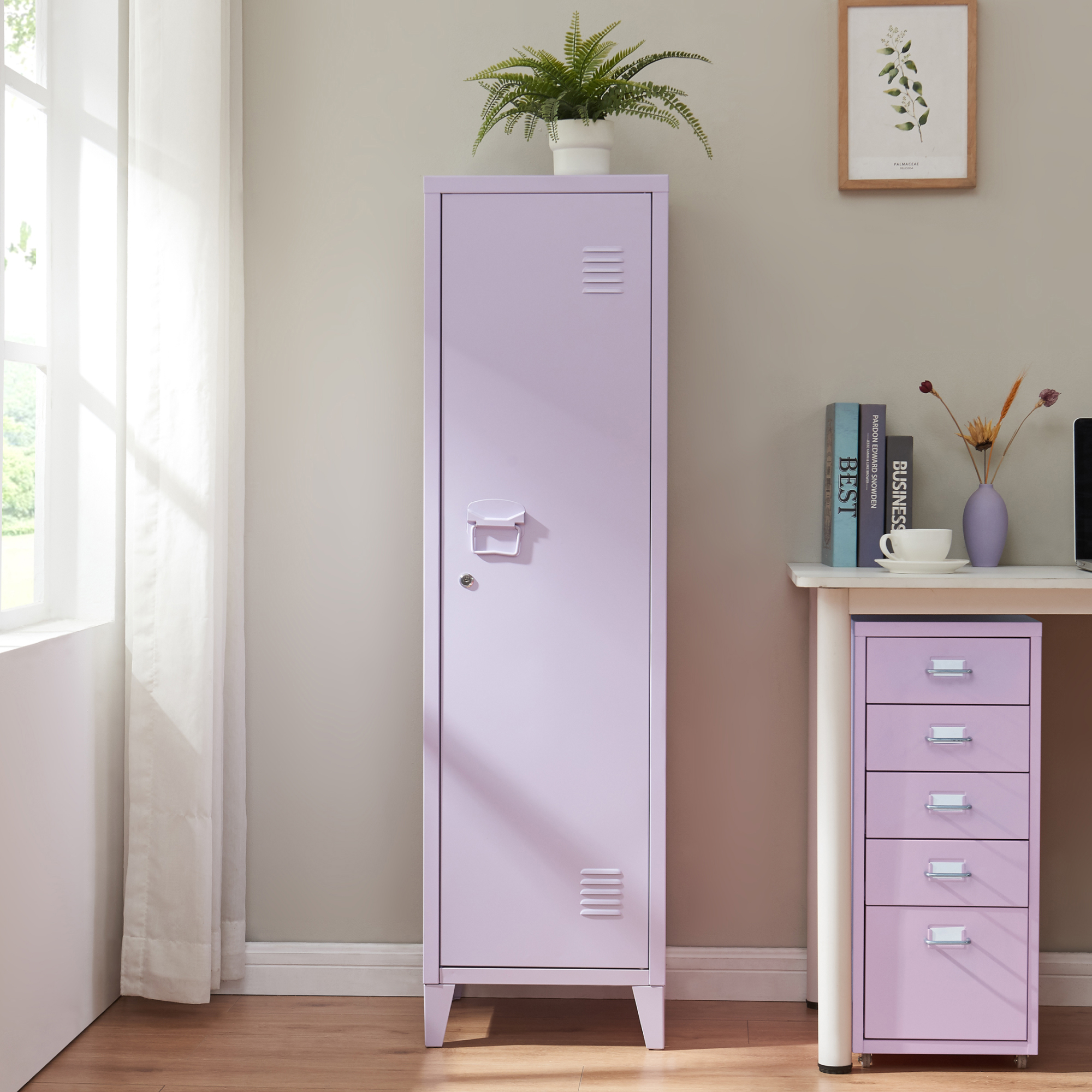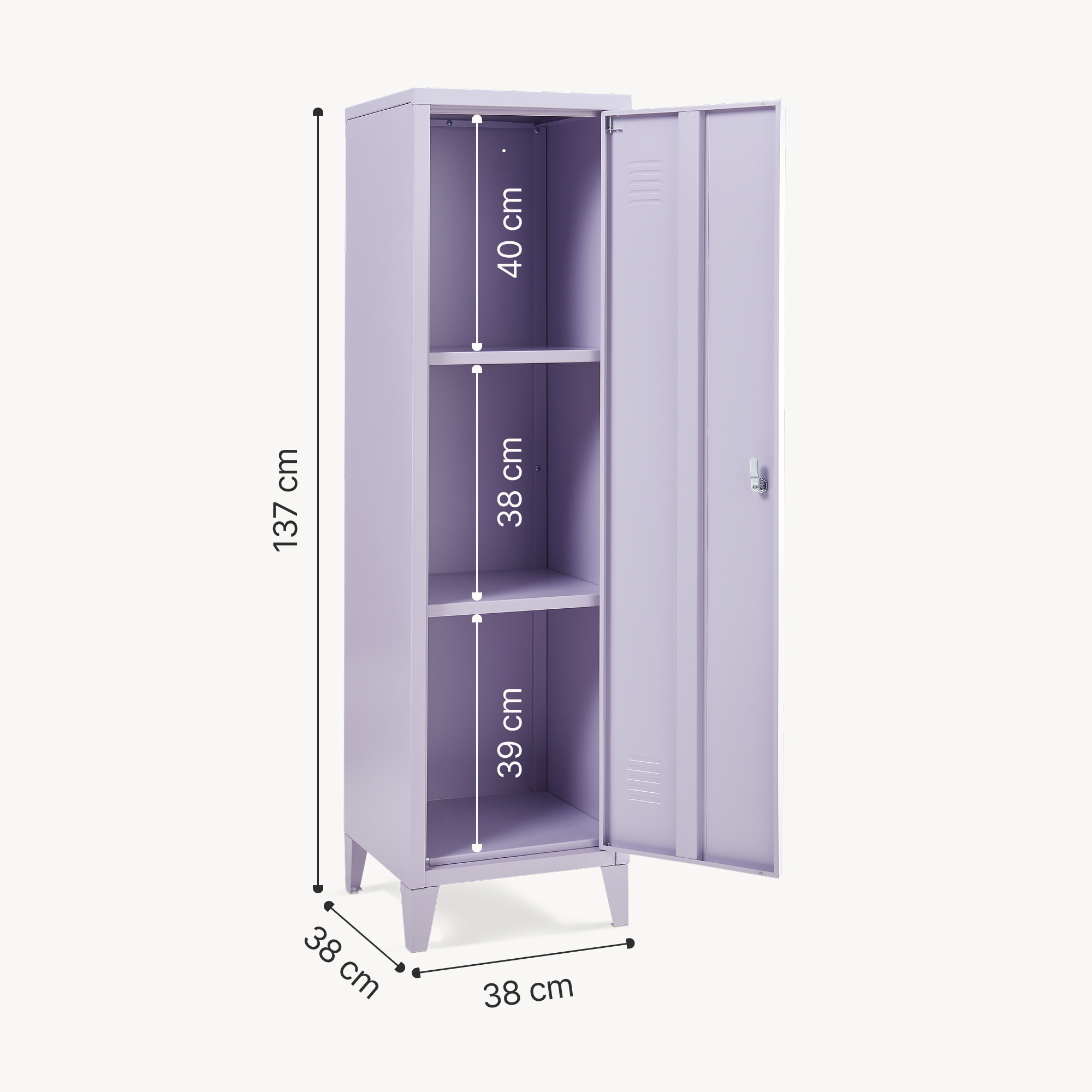 Dulap metalic vestiar lila cu 1 ușă și 2 rafturi, 137x38x38 cm