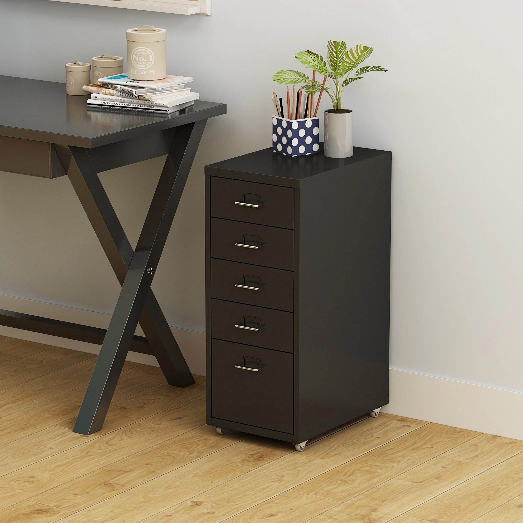 Dulap mobil de birou cu 5 sertare din otel, 69x28x41 cm, negru mat