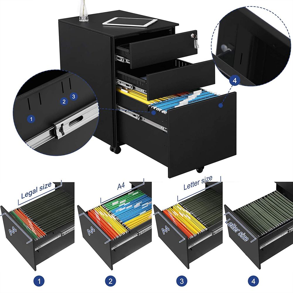 Acest fiset metalic cu sertare este prevazut cu 3 compartimente practice, dintre care sertarul inferior include sina pentru dosare A4, Letter si Legal. Sistemul cu glisiere premium cu extensie completa permite deschiderea usoara chiar si atunci cand sertarele sunt incarcate. In plus, dulapul este echipat cu roti pentru deplasare rapida si cu incuietoare pentru protectia documentelor importante.