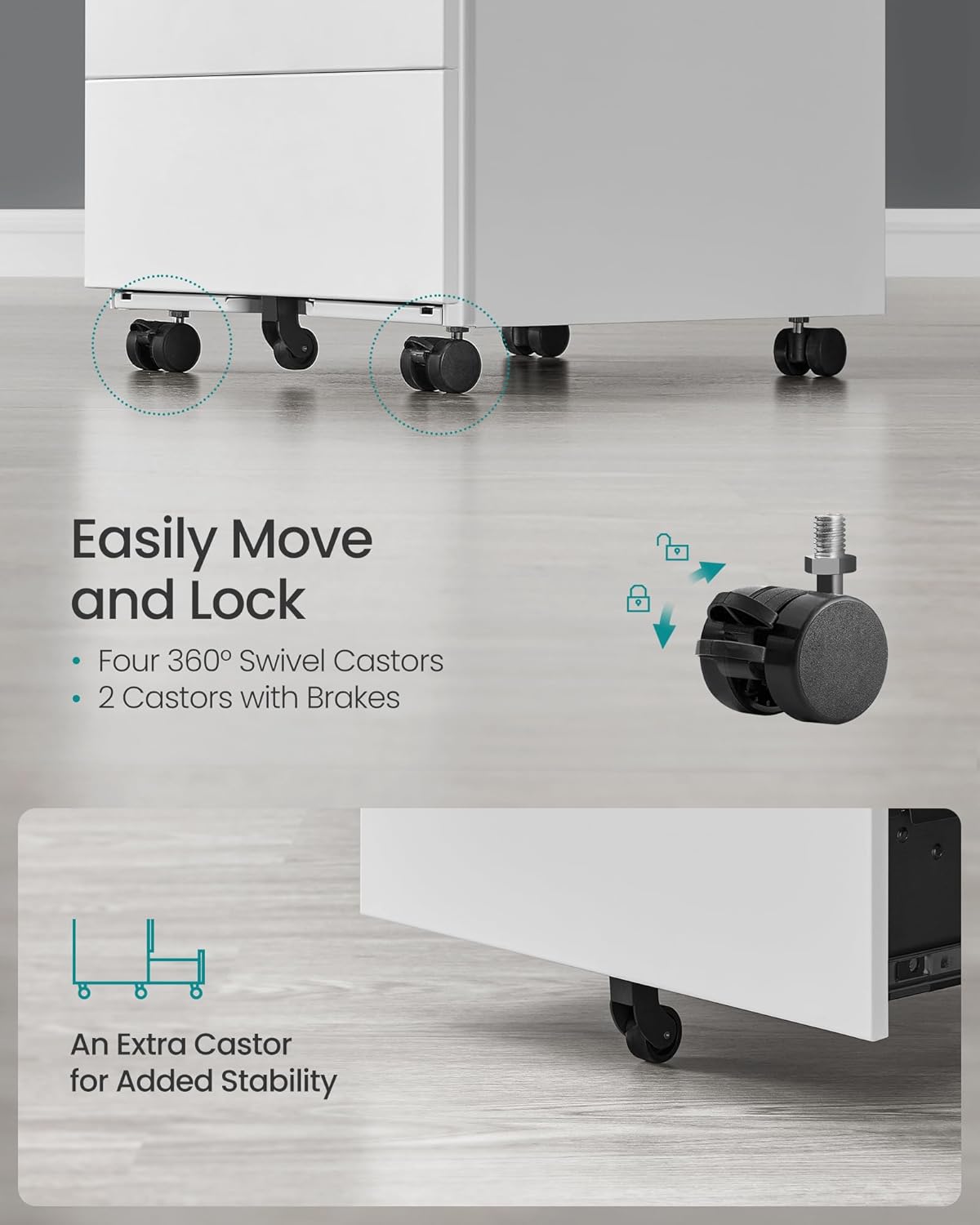 Datorita rotilor integrate, dulapul se muta usor oriunde ai nevoie, iar cele 2 roti cu frana asigura o pozitionare stabila. Produsul vine gata asamblat, astfel ca il poti folosi imediat dupa livrare. Compartimentul superior este practic pentru obiecte mici, precum pixuri, agrafe sau notite.