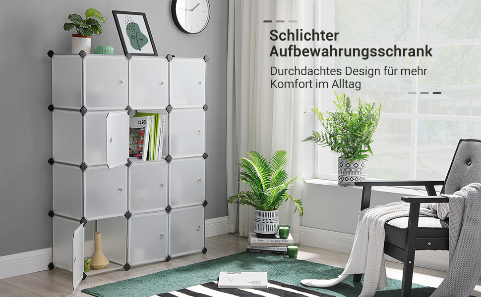 Organizezi mai ușor orice colț al casei cu acest dulap modular cu 12 cuburi SONGMICS, ideal pentru depozitare pantofi, haine, jucării sau accesorii. Designul alb transparent oferă un aspect curat și modern, iar construcția modulară îți permite să adaptezi raftul în funcție de spațiul disponibil, fie că îl folosești în dormitor, hol, dressing, debara sau pod.