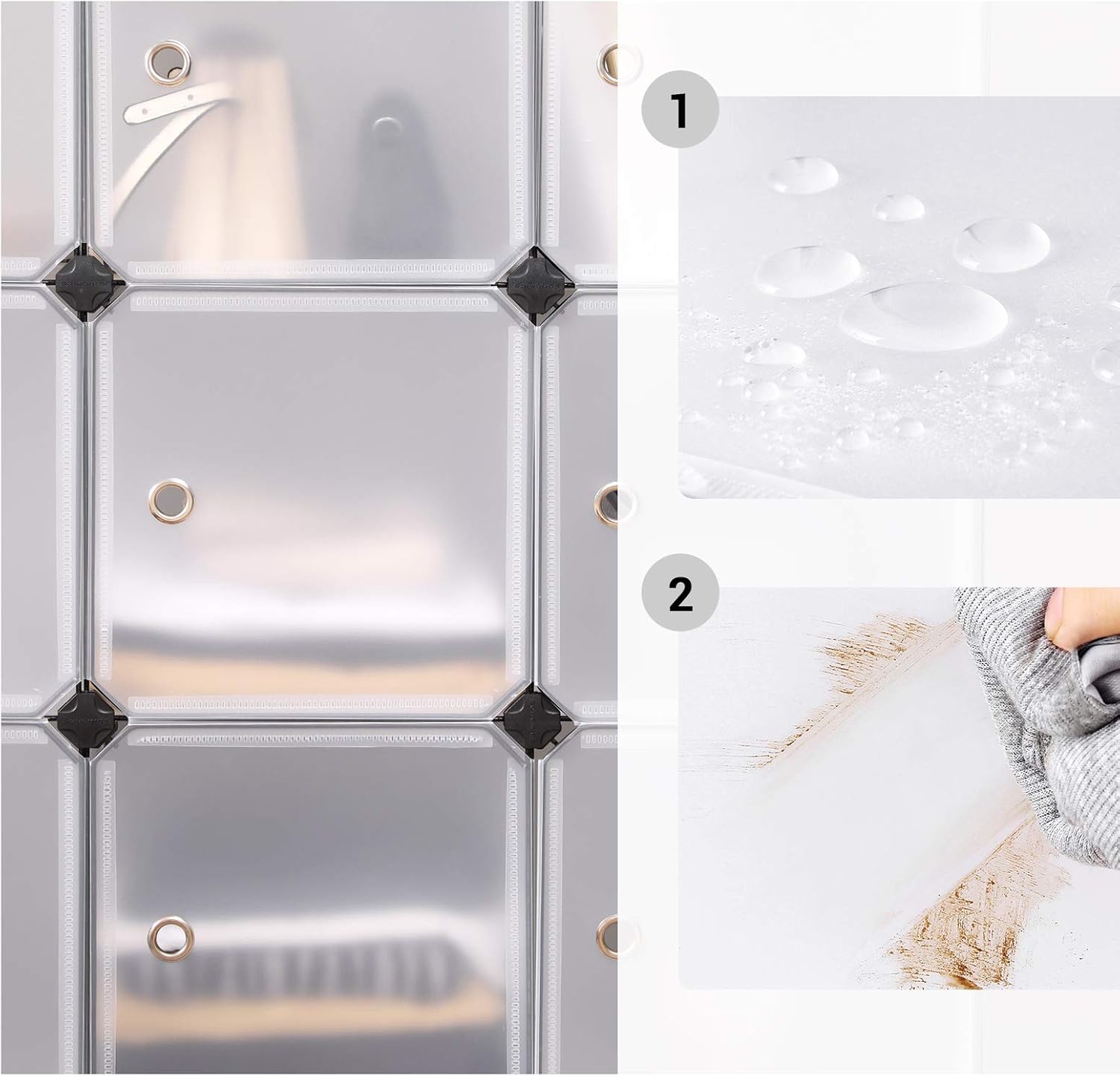 Fiecare compartiment are dimensiuni generoase, astfel încât să poți păstra lucrurile ordonate și protejate de praf. Ușile cu sistem de închidere integrat ajută la menținerea conținutului în siguranță, iar panourile din plastic rezistent la apă se curăță rapid cu o lavetă umedă. În plus, acest organizator modular este ușor de transportat și reasamblat atunci când vrei să îi schimbi poziția sau forma.