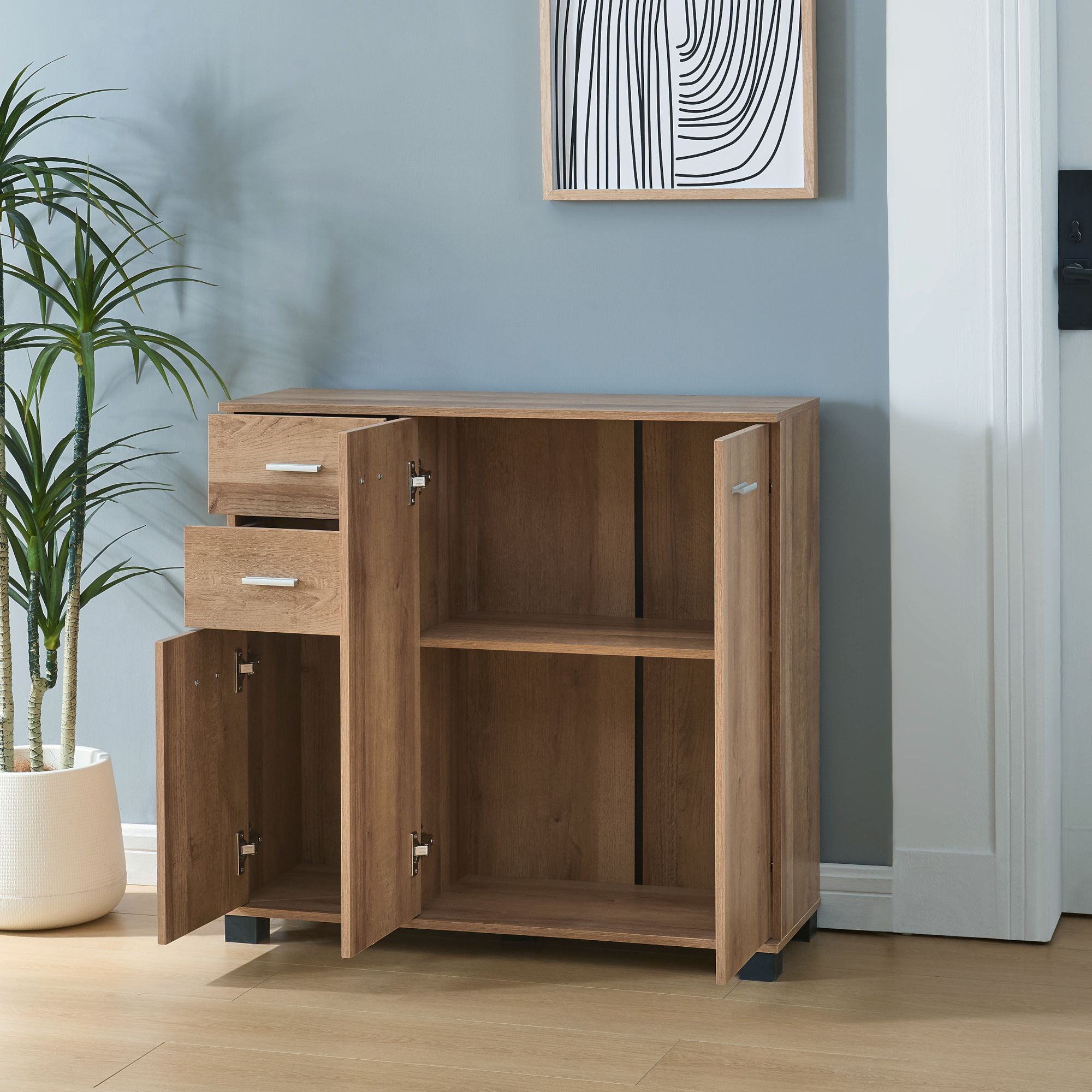 Cele trei usi ale dulapului se deschid si se inchid usor, asadar veti aveti acces rapid la incaltaminte. Sertarul situat la nivel superior ofera posibilitatea depozitarii accesoriilor, cum ar fi periile de pantofi, sireturile sau a altor mici dispozitive.Alegere exceptionala in ceea ce priveste depozitarea ordonata cu economie de spatiu.