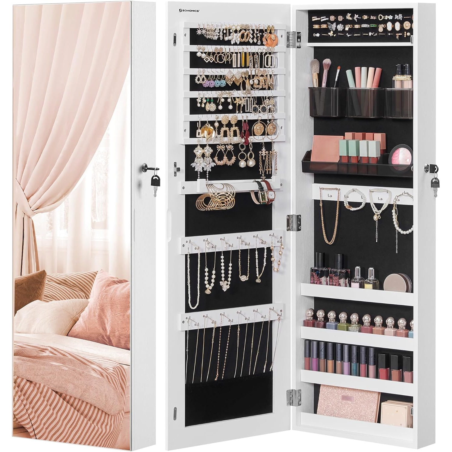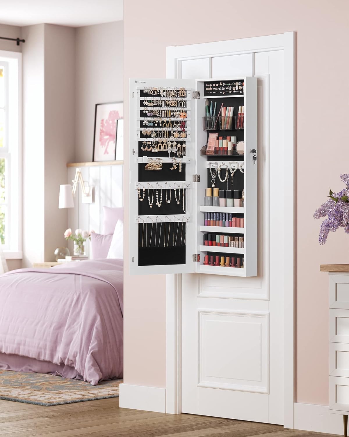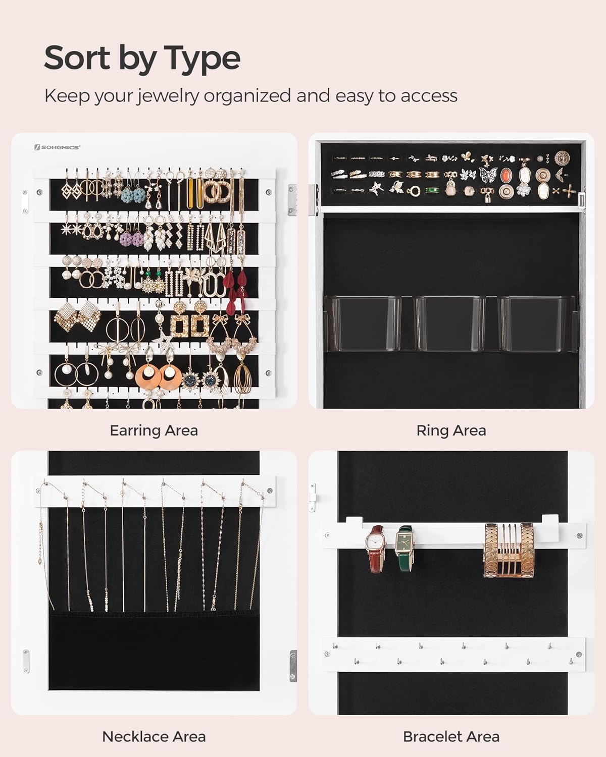 Acest dulap de bijuterii cu oglinda este potrivit pentru depozitarea ordonata a accesoriilor de zi cu zi si a cosmeticelor preferate. Se monteaza usor pe usa sau pe perete si este ideal pentru incaperi unde vrei sa pastrezi un aspect curat, aerisit si elegant.