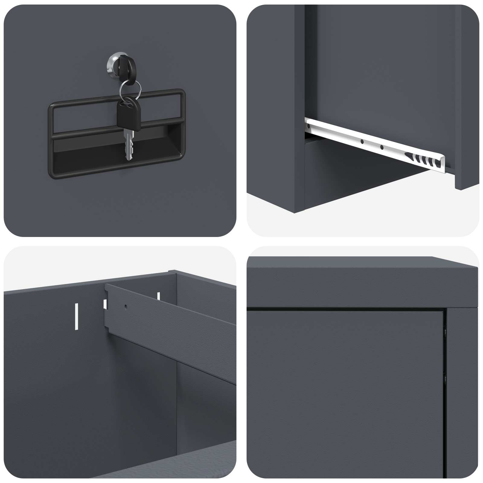 - Încuietori cu came foarte funcționale: Dulapul vine cu încuietori cu came care asigură siguranța. Fiecare încuietoare ține sertarele închise, protejând conținutul de accesul neautorizat. E o caracteristică super importantă pentru birouri care se ocupă cu documente sensibile.