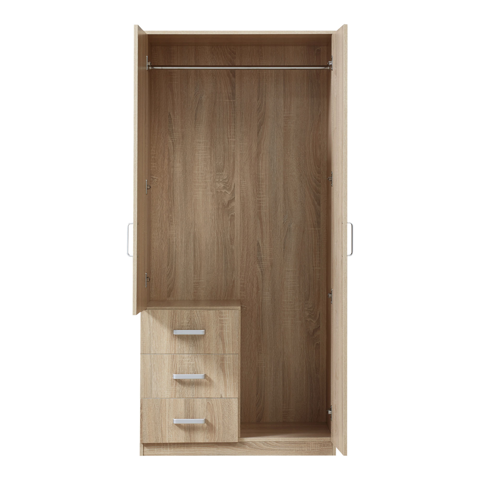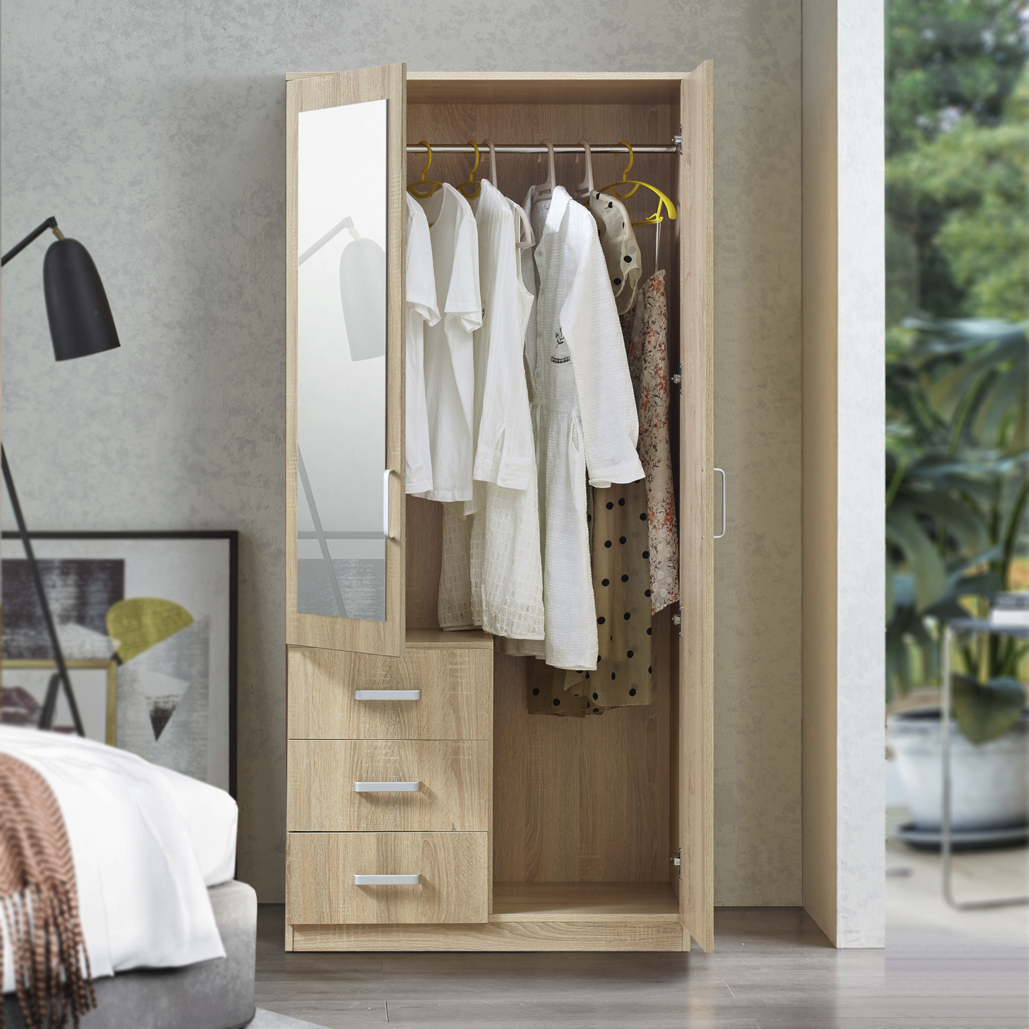 Prevăzut cu 2 uși, o bară pentru umerașe și 3 sertare, dulapul te ajută să păstrezi hainele, accesoriile și alte obiecte personale în ordine. Oglinda integrată pe una dintre uși este practică pentru rutina zilnică și contribuie vizual la senzația de spațiu mai aerisit.