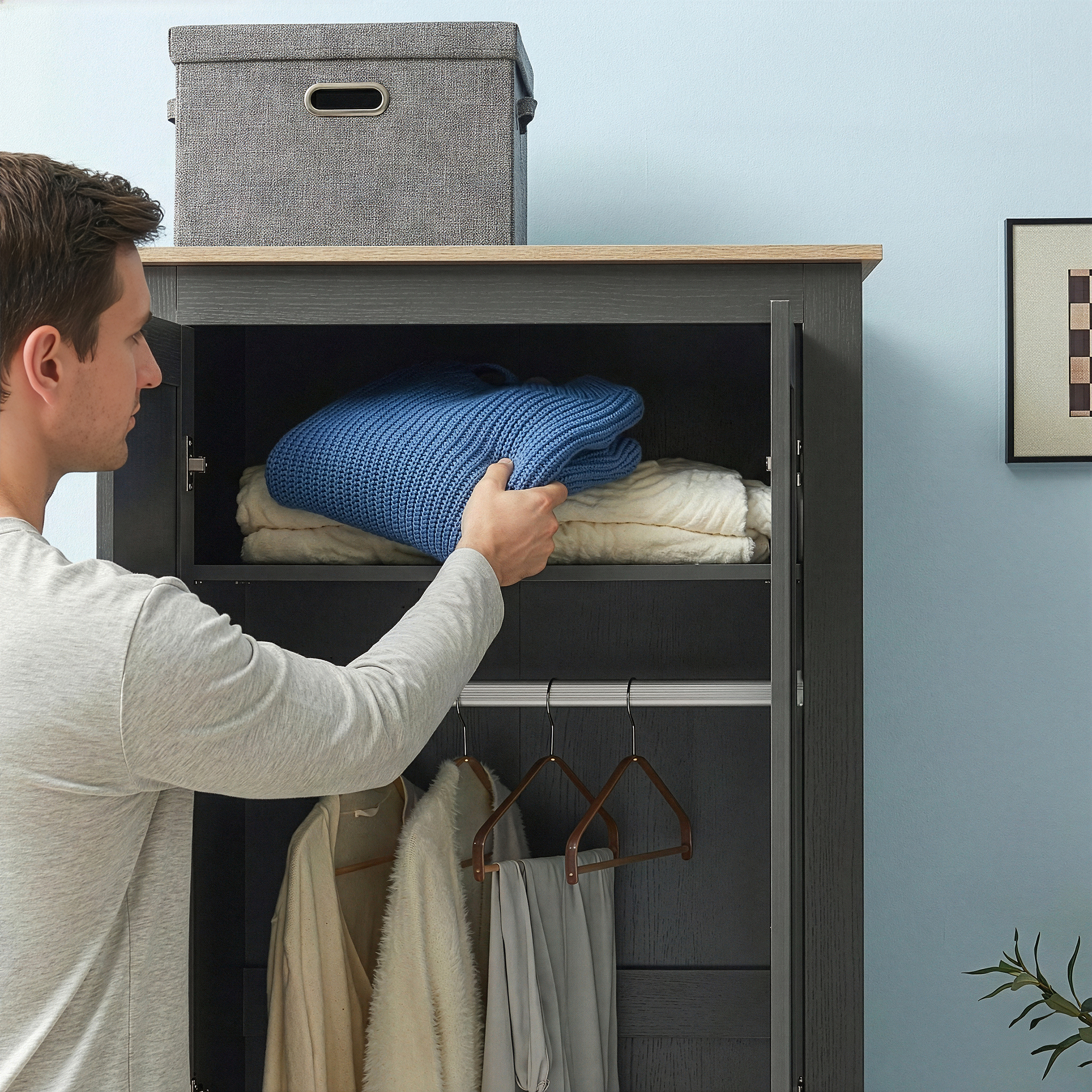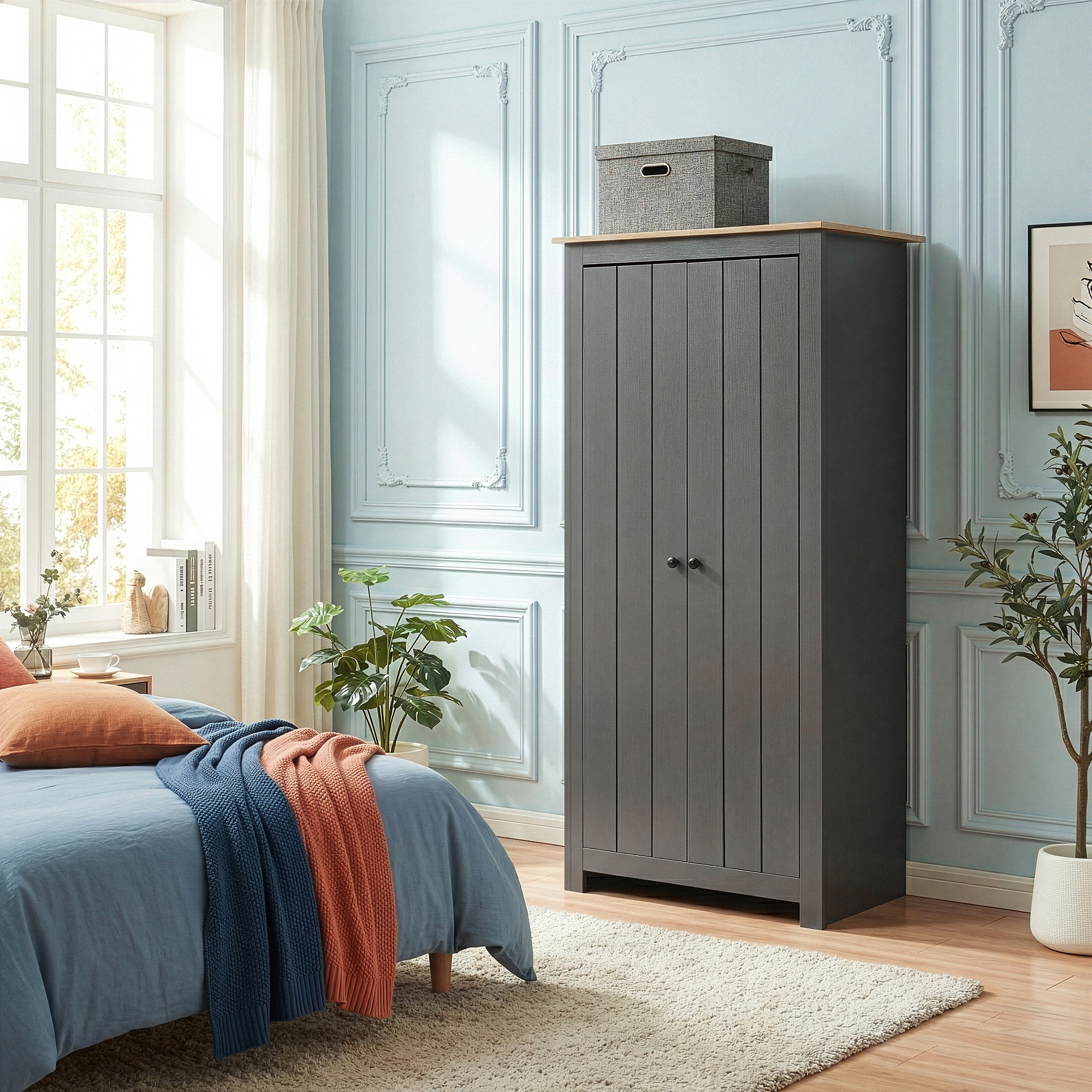 Acest dulap gri cu rafturi si bara este ideal pentru depozitarea organizata a hainelor, incaltamintei usoare, palariilor, gentilor si accesoriilor. Poate fi folosit cu succes in dormitor, camera de oaspeti sau intr-un spatiu dedicat dressingului.