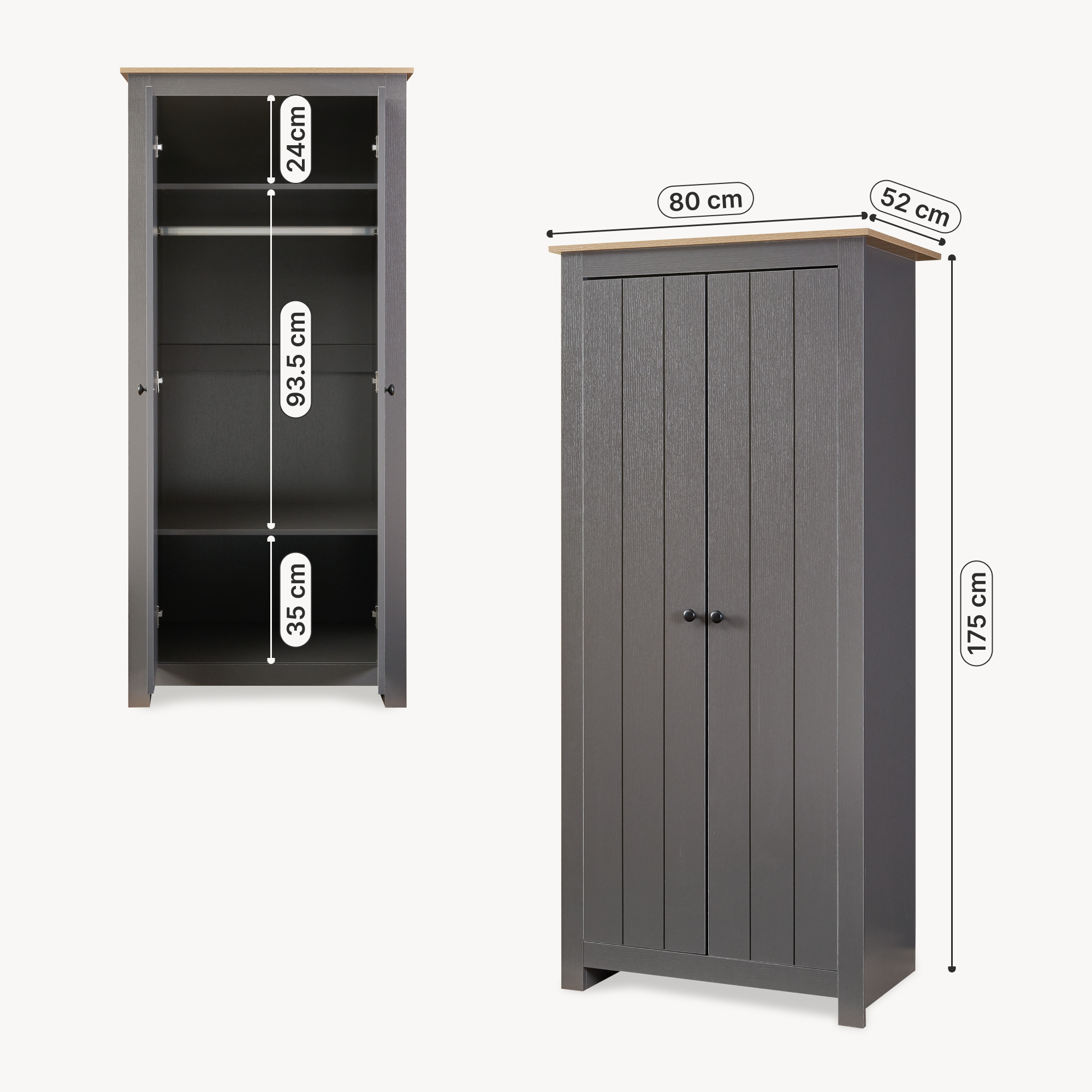 La interior, dulapul este compartimentat practic pentru organizarea eficienta a garderobei. Dispune de o bara pentru umerase generoasa, potrivita pentru camasi, rochii, jachete sau sacouri, dar si de doua rafturi utile pentru accesorii, cutii, genti sau articole pliate. Astfel, ai totul la indemana si bine organizat zi de zi.