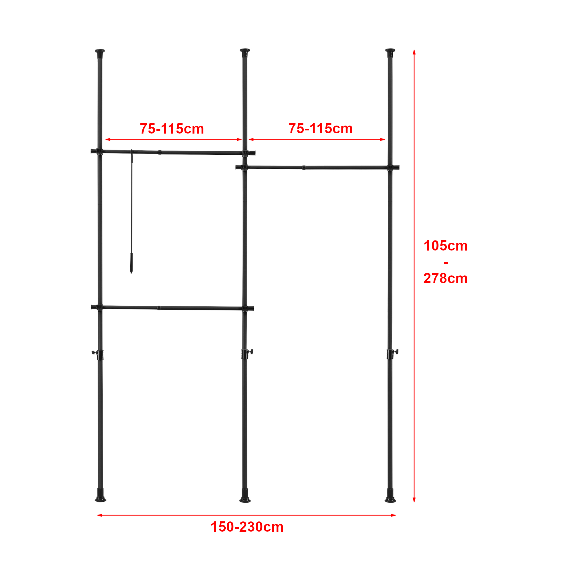 Datorita structurii ajustabile, poti adapta cu usurinta inaltimea si lungimea in functie de spatiul disponibil. Cele 3 bare pentru haine ofera suficient loc pentru camasi, rochii, pantaloni, jachete sau accesorii, iar finisajul negru adauga un aspect elegant si usor de integrat in decor.