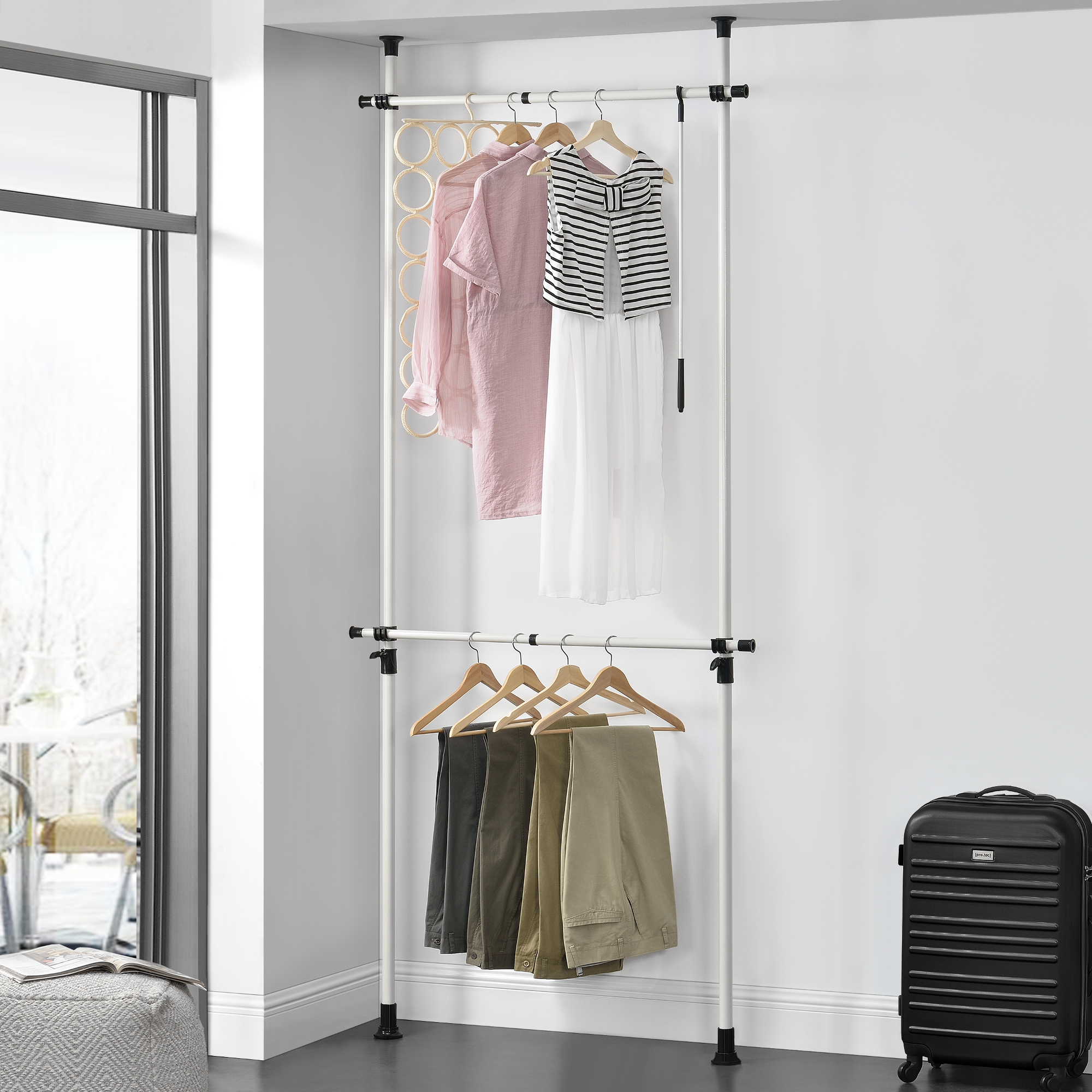 Datorita structurii extensibile, acest suport telescopic pentru haine poate fi ajustat atat pe inaltime, cat si pe lungime, pentru a se adapta perfect nevoilor tale. Cele 2 bare reglabile ofera suficient spatiu pentru haine, accesorii sau textile, iar ajutorul de agatare inclus iti permite sa folosesti cu usurinta si zona superioara.