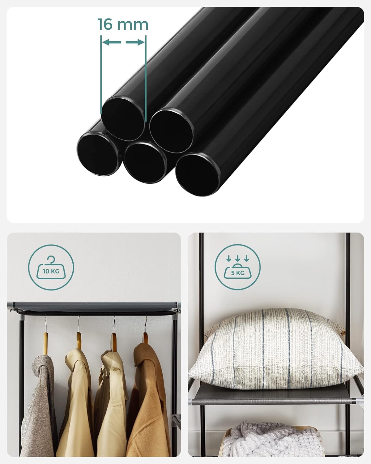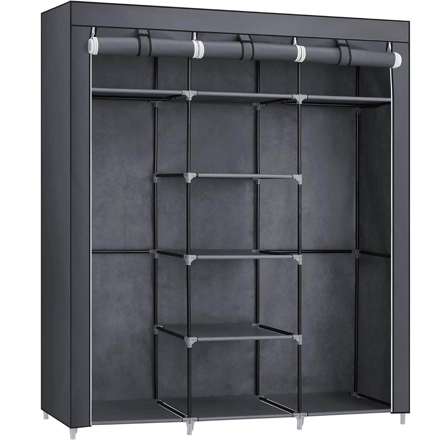 Organizeaza-ti hainele simplu si eficient cu acest dulap textil pentru haine Songmics, ideal pentru dormitor, hol, camera de oaspeti sau spatii unde ai nevoie de depozitare practica. Designul cu 3 compartimente iti permite sa separi hainele pe categorii, iar bara de agatare este potrivita pentru camasi, jachete sau rochii. Husa textila gri protejeaza continutul de praf, in timp ce structura metalica ofera stabilitate in utilizarea de zi cu zi.