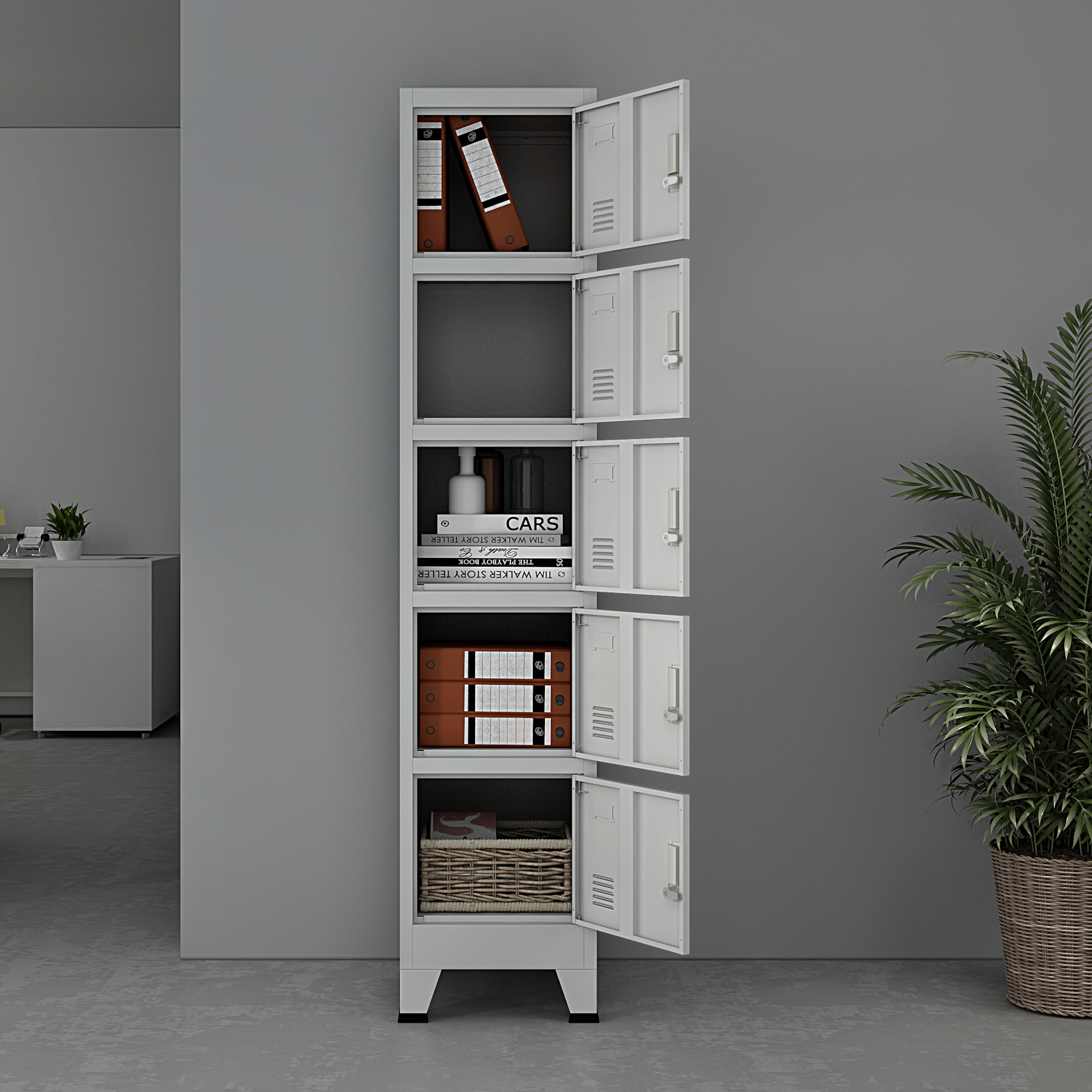 Dulapul vestiar metalic Joroinen este o soluție practică și sigură pentru organizarea obiectelor personale în birouri, școli, vestiare, săli de sport sau spații comerciale. Cu un design vertical, compact și elegant, acest dulap metalic cu 5 uși ajută la economisirea spațiului și oferă depozitare separată pentru mai mulți utilizatori.