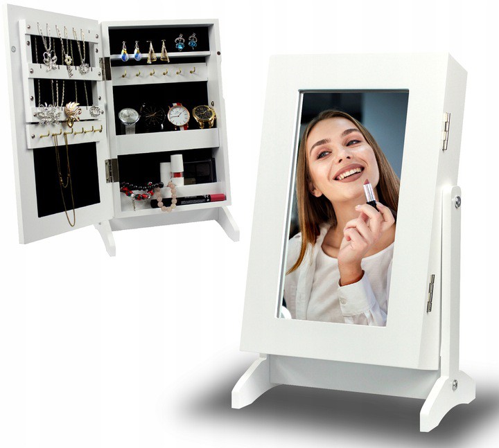 Utilizare: pozitioneaza dulapiorul pe o suprafata stabila, deschide usa cu oglinda si organizeaza accesoriile in compartimentele dedicate. Este potrivit pentru dormitor, dressing sau zona de machiaj, oferind acces rapid la bijuteriile folosite frecvent.
