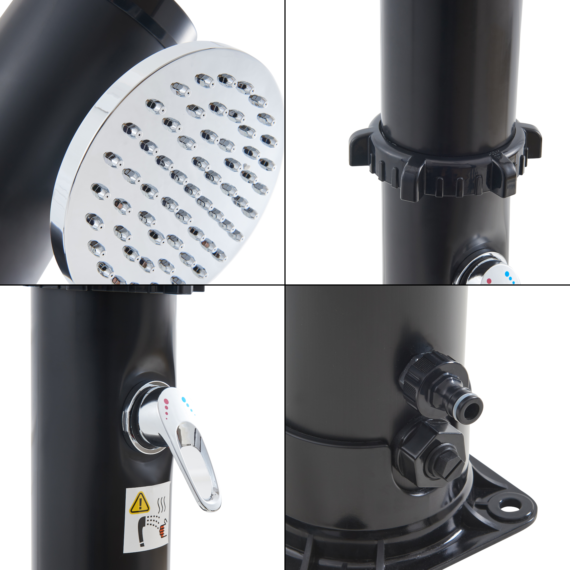 Acest duș solar exterior este perfect pentru clătirea rapidă înainte sau după piscină, pentru răcorire după plajă ori pentru activități în aer liber. Rezervorul de 18 litri poate încălzi apa până la 60°C în condiții optime de expunere solară, iar temperatura se reglează ușor cu ajutorul bateriei cu monocomandă.