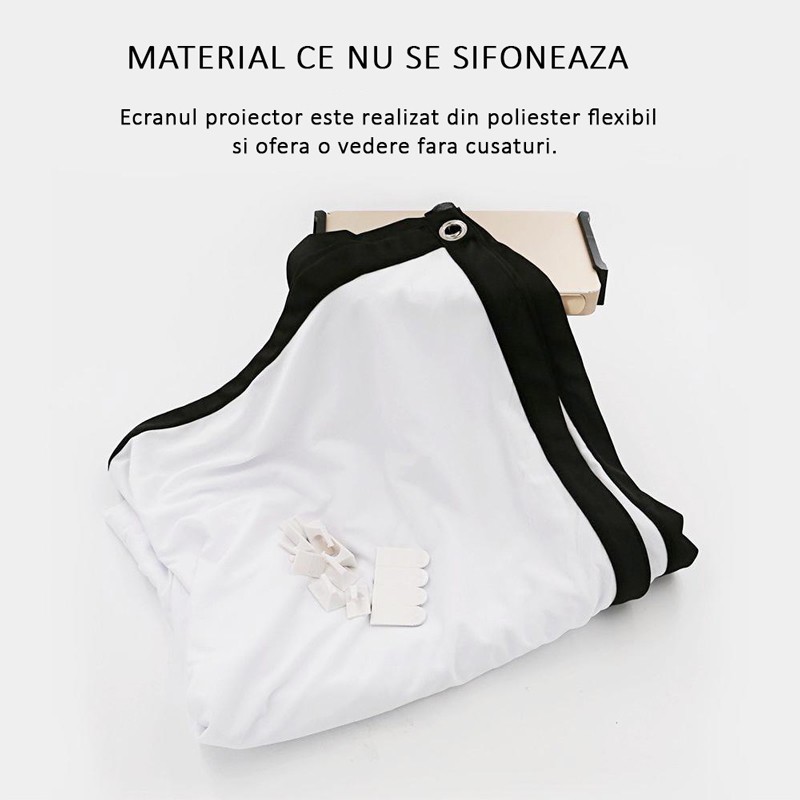 Utilizare: fixează ecranul pe un perete sau pe o suprafață plană, întinde-l la dimensiunea dorită și aliniază proiectorul pentru un format 16:9. Recomandat pentru filme, gaming, meciuri și prezentări.