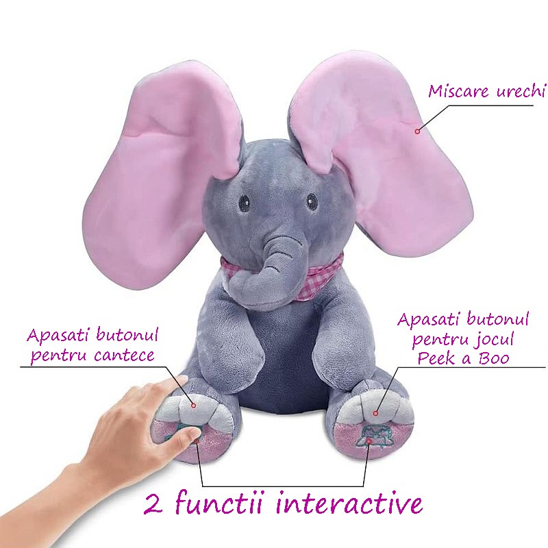 Transformă joaca într-un moment plin de râsete cu acest elefănțel de plus interactiv Peek-a-Boo! Are două moduri distractive: cântă melodii în engleză și face Cucu-Bau mișcând urechile. Este realizat din plus moale, plăcut la atingere, perfect pentru îmbrățișat și pentru jocuri de imitație.