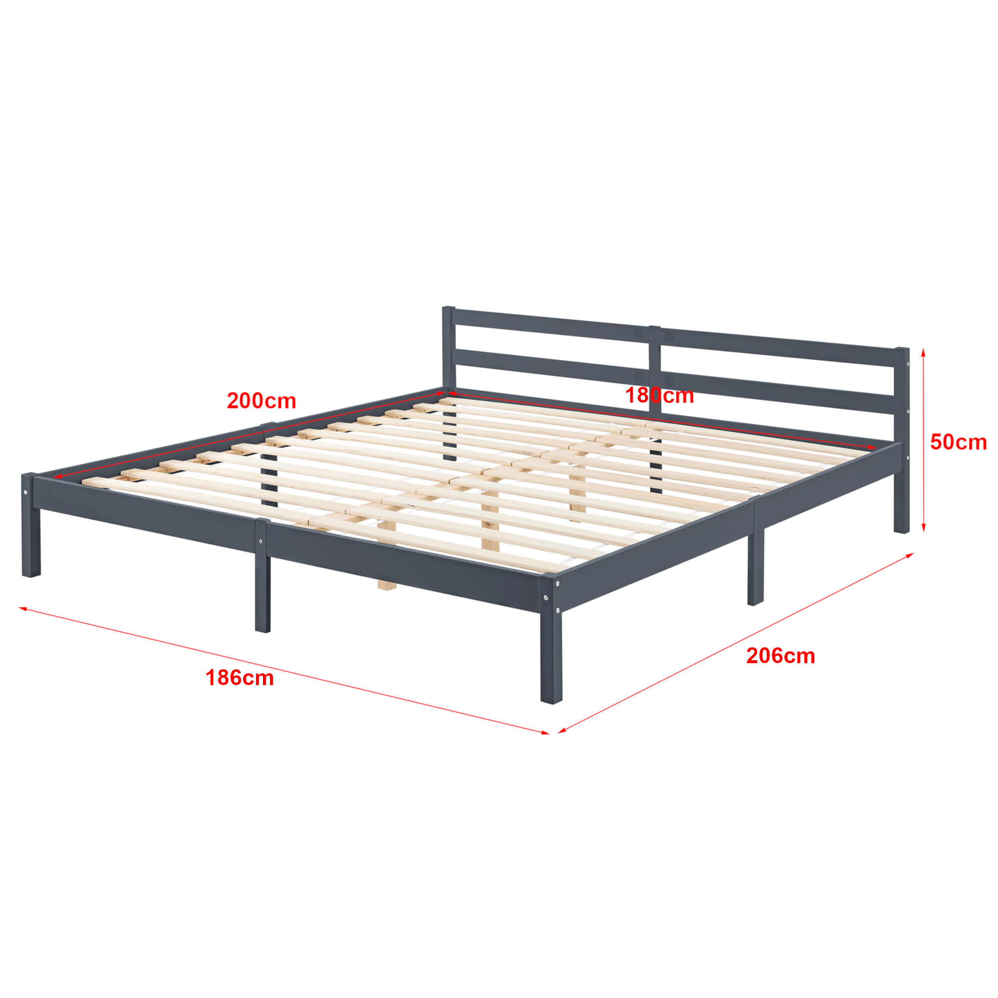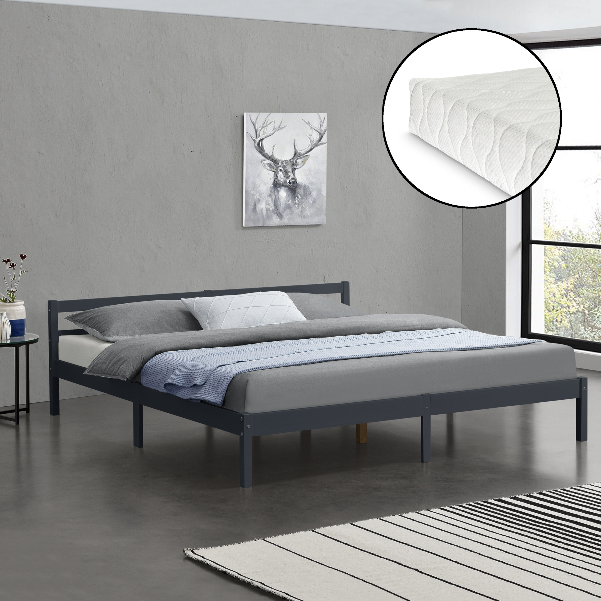 [en.casa]® Pat rama lemn Nakkila 180DG, 180 x 200 cm, lemn brad/spuma rece, 200 Kg, dublu, gri inchis mat, cu saltea si gratar pat HausGarden Leisure