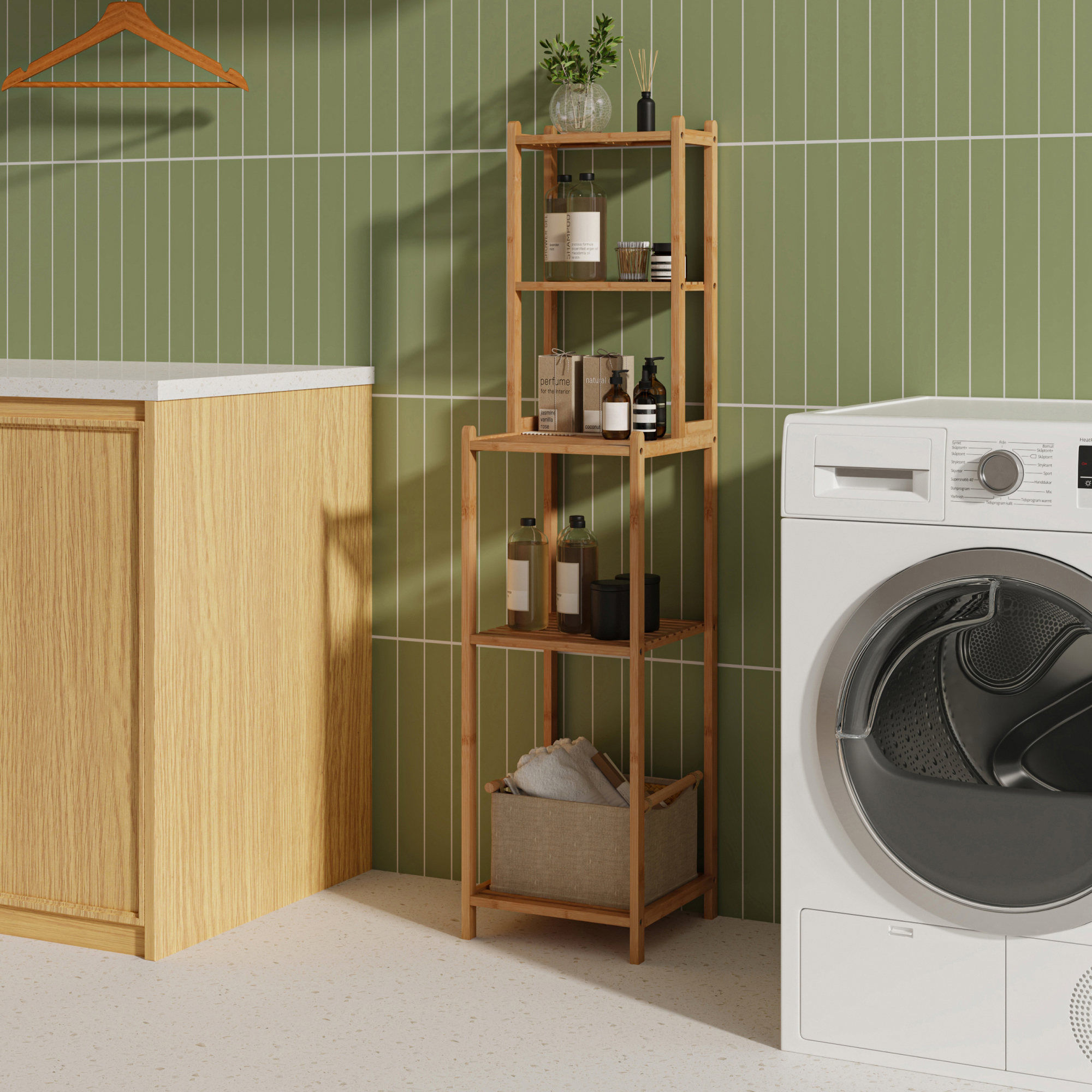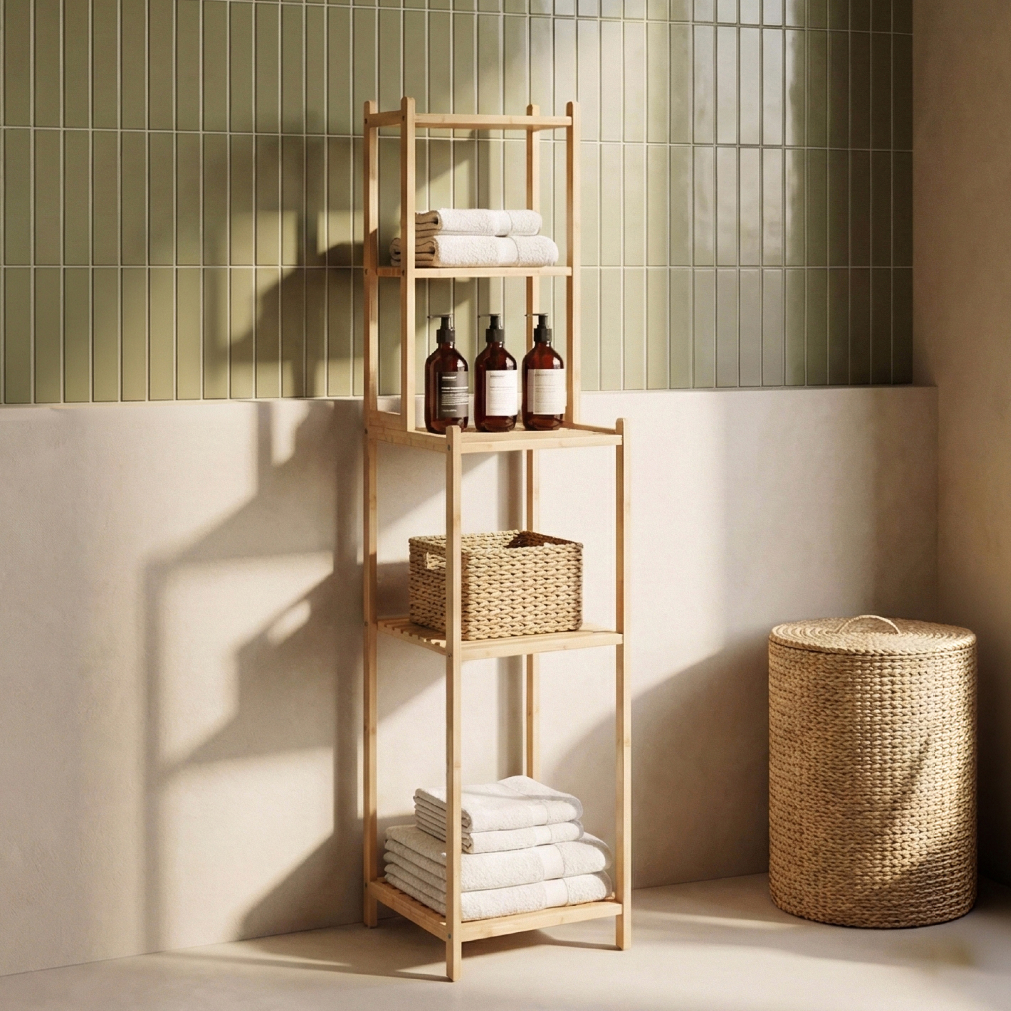 Etajera de baie Anun este soluția practică și elegantă pentru organizarea eficientă a spațiului din baie. Cu un design vertical, suplu și modern, această etajeră baie din bambus valorifică înălțimea încăperii și oferă spațiu suplimentar de depozitare fără să ocupe mult loc la sol.
