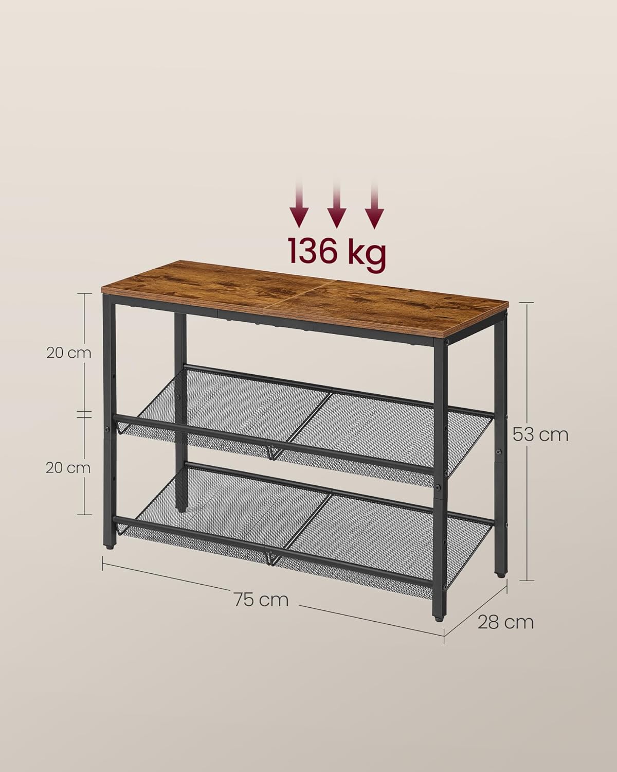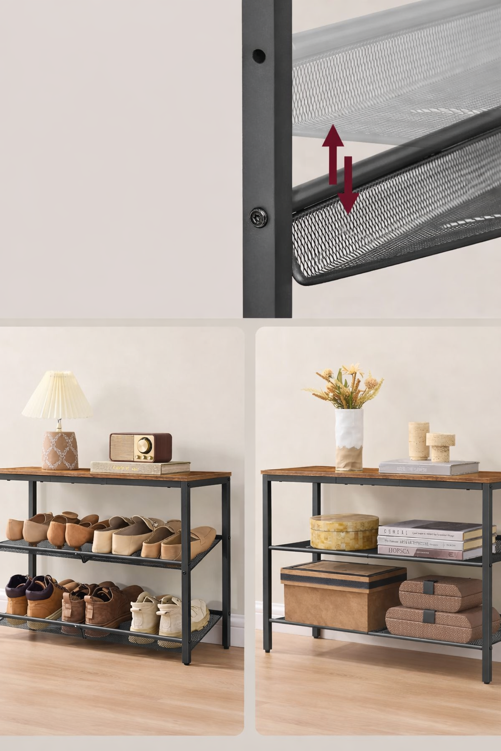 Pastreaza holul ordonat cu aceasta etajera pentru pantofi VASAGLE, conceputa pentru organizare practica si aspect modern. Combinatia dintre blatul in nuanta maro rustic si cadrul din otel negru ofera un autentic stil industrial, usor de integrat in hol, dressing sau zona de intrare. Cele 3 niveluri iti permit sa depozitezi eficient pantofi sport, eleganti sau ghete scurte, iar blatul superior este util pentru genti, chei, decoratiuni sau alte accesorii de zi cu zi.