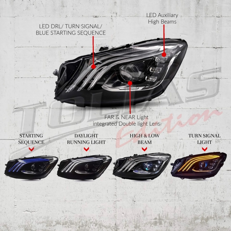 Aceste faruri sunt menite sa va ajute la realizarea conversiei Mercedes-ului dvs S-class W222 2013-2017 in varianta Facelift 2018+.