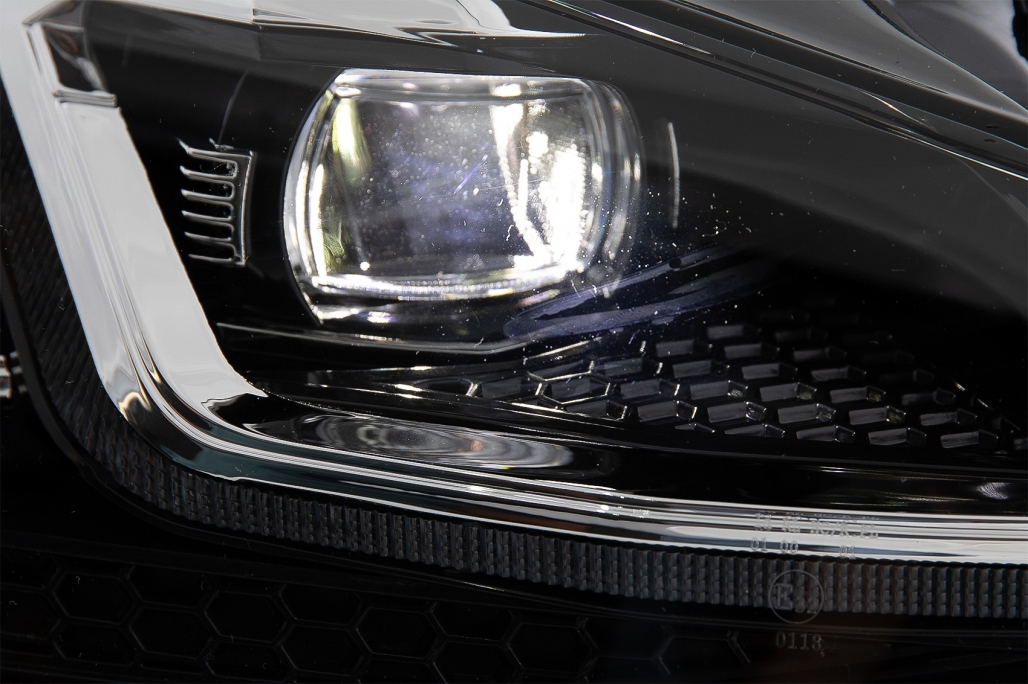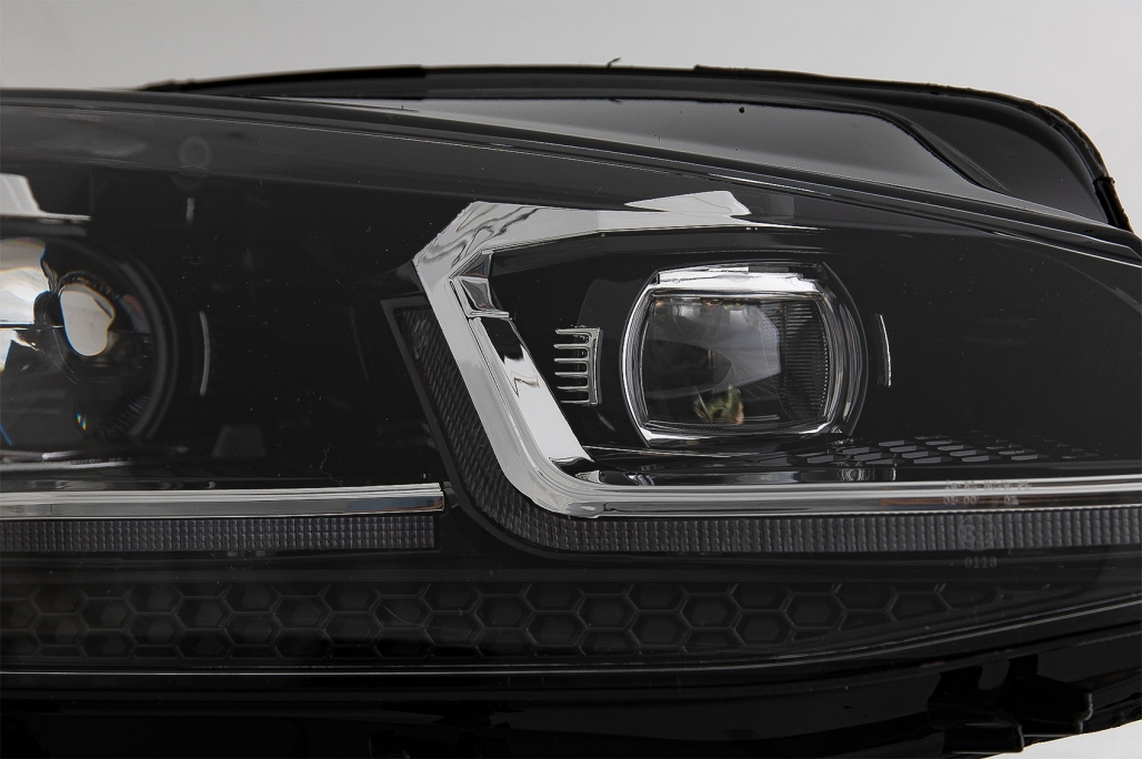 Faruri LED echipate cu lumina de zi Design: GOLF 7.5 Montaj Plug and Play Faza Scurta: Bec H7 Halogen (nu este inclus) Faza Lunga: LED Semnalizare: LED Dinamica Lumina de zi: LED Echipate cu motor pentru reglare