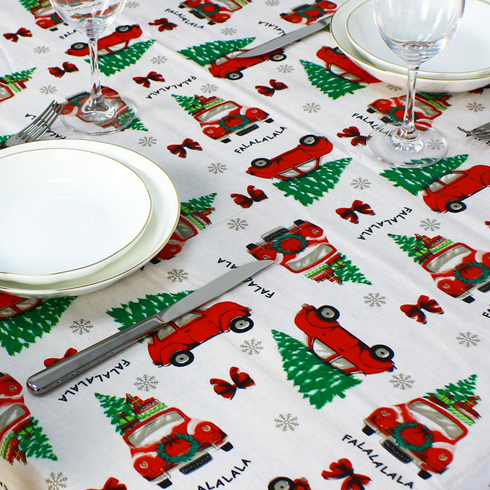Decorează-ți masa cu această față de masă de Crăciun. Fața de masă cu model de mașină cu brad oferă o atmosferă veselă cinei festive de sărbători.