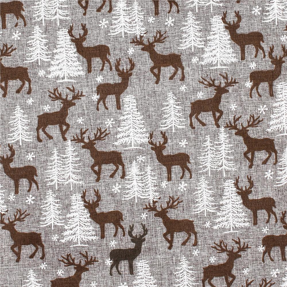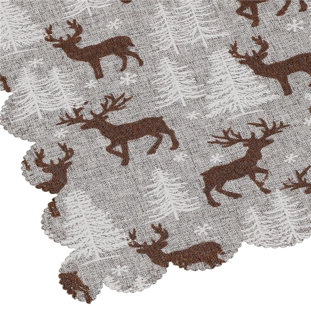 Adauga un plus de farmec mesei festive cu aceasta fata de masa decorativa de Craciun, realizata din stofa si decorata cu motive de iarna. Nuanta gri eleganta, modelul cu brazi albi, fulgi de nea si caprioare maro transforma rapid orice masa intr-un decor cald si primitor, perfect pentru sarbatori.
