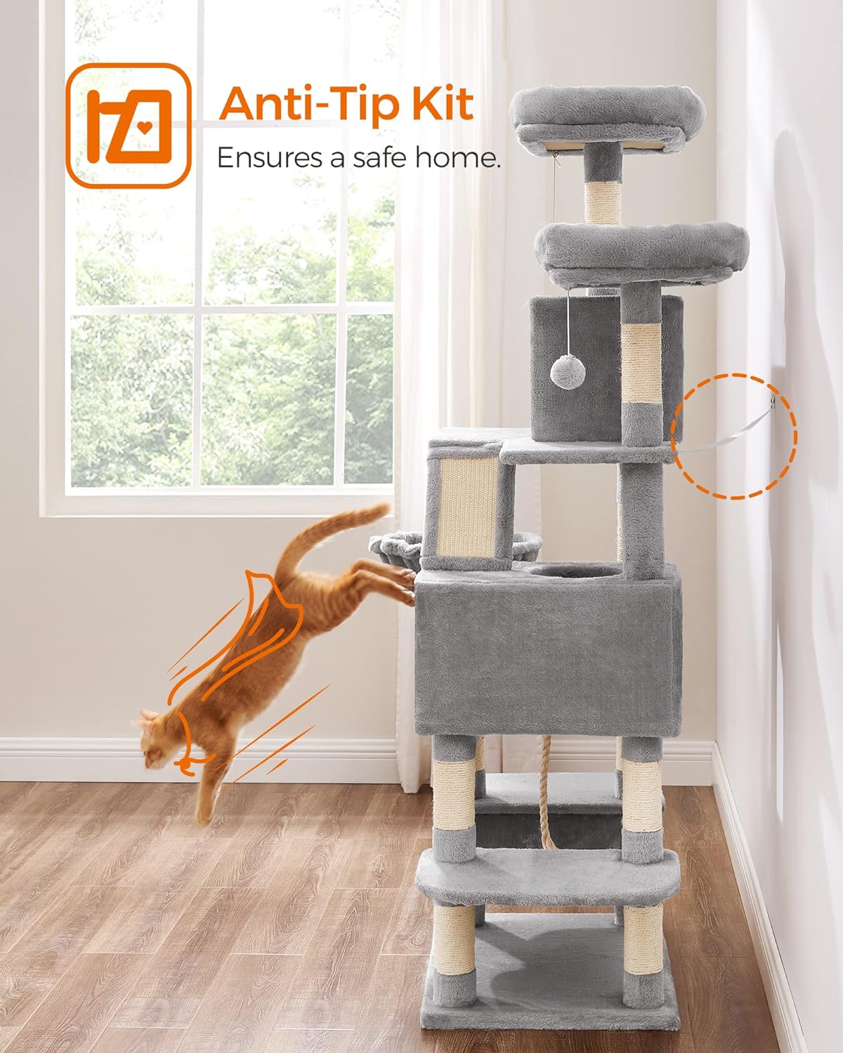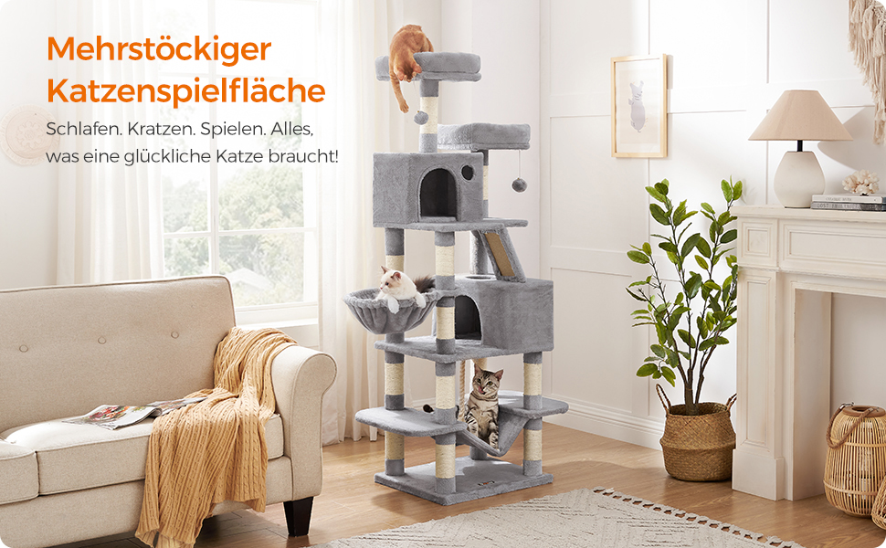 FEANDREA Ansamblu de joaca pentru pisici, tip copac, cu 3 culcusuri, hamac si 2 ascunzatoare, 55x45x168cm, gri deschis Household NewTrend