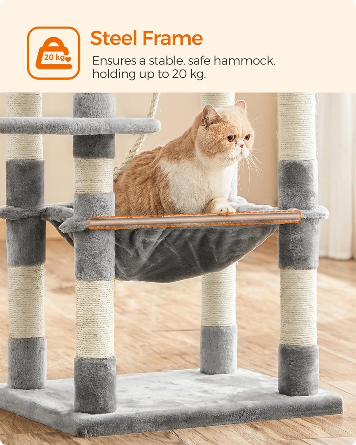Specificatii: Culoare: Gri deschis Material: MDF (placi de fibre de densitate medie), plus, sisal Dimensiune produs: 55 x 45 x 143 cm (L x l x H) Greutate produs: 14,9 kg Continutul pachetului: 1 x Arbore de pisici 1 x Instructiuni Despre acest articol Totul la vedere: pe cele 2 platforme de vizionare dragalase cu captuseala groasa, pisicile tale au o vedere perfecta asupra a ceea ce se intampla in apartamentul tau.Elementele individuale ale ansamblului pentru pisici sunt aranjate pe diferite niveluri, astfel incat chiar si pisoii mici sau pisicile mai in varsta sa poata urca cu usurinta.Plus gros, sisal rezistent la zgarieturi, placi robuste din lemn prelucrat - materialele acestui turn pentru pisici vor impresiona chiar si pe cea mai pretentioasa felina.