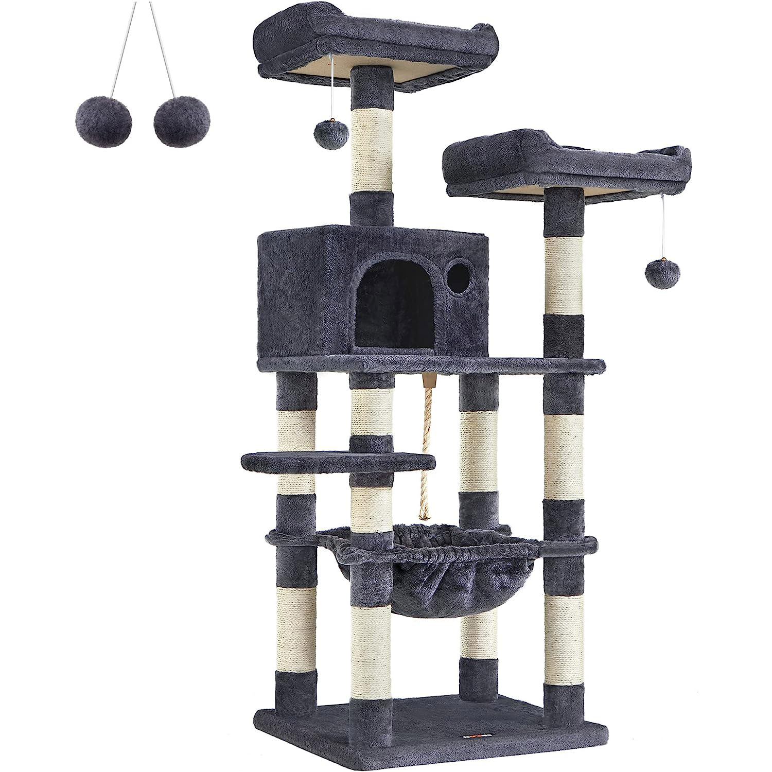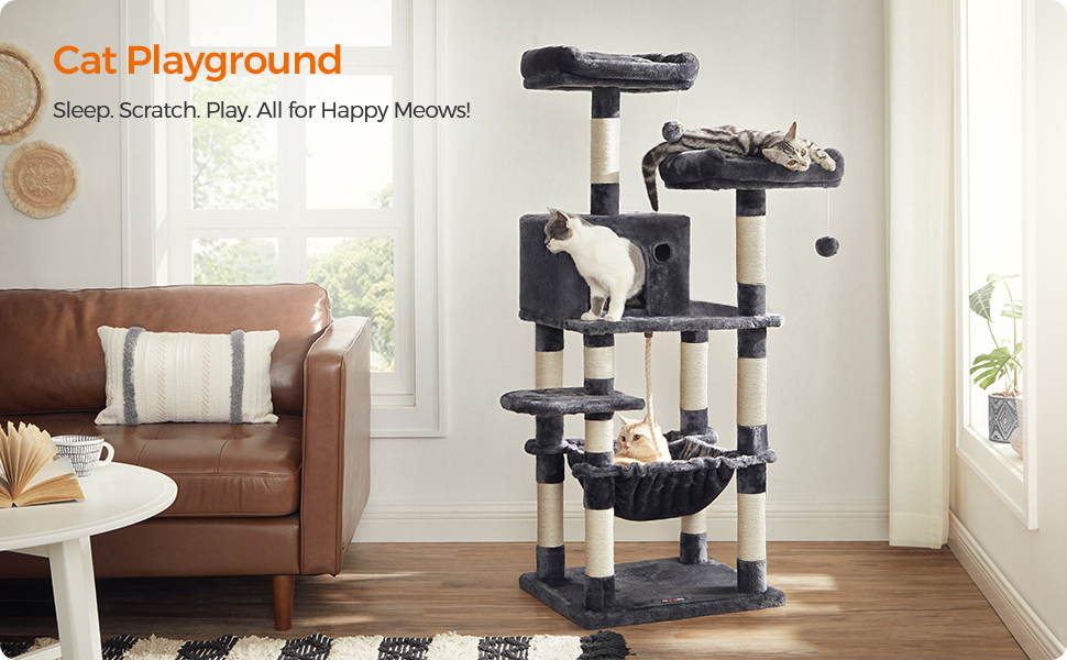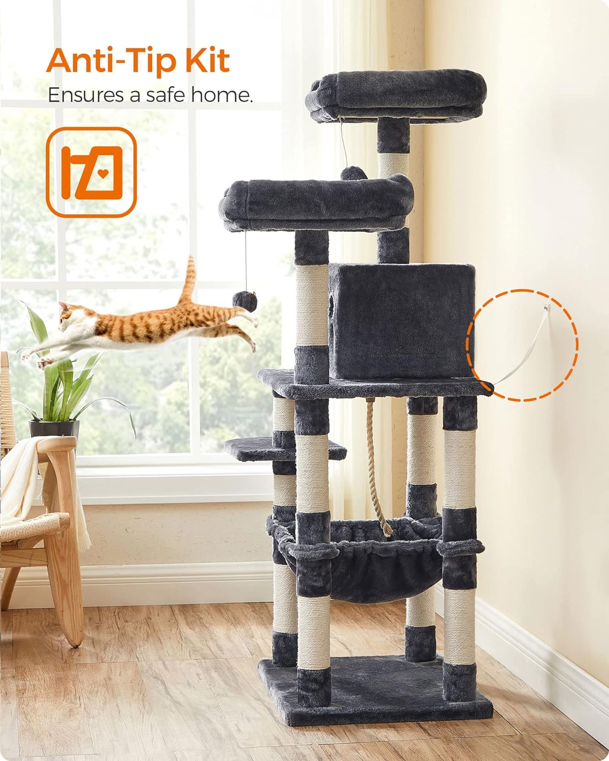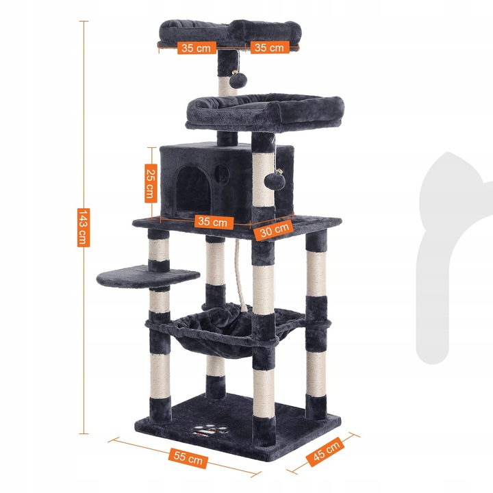 Specificatii: Culoare: gri fumuriu Material: Placi aglomerate, tesatura plusata, franghie de sisal Dimensiunea produsului:55 x 45 x 143 cm Greutatea produsului: 14,9 kg Max. Capacitate de incarcare statica totala: 65 kg Continutul pachetului: 1 x Arbore pentru pisici 1 x Kit de accesorii 1 x Kit antirasturnare 1 x Instructiuni Despre acest articol Cele 2 puncte din varf ale acestui arbore de pisici, inclusiv marginile inaltate, sunt umplute pana la refuz cu captuseala moale, astfel incat pisicile tale sa se poata odihni in fericire toata ziua.Hamac, mai stabil ca niciodata: Sustinut de un cadru robust din otel fixat pe 4 stalpi puternici, acest hamac mare si pufos poate sustine pana la 15 kg - un loc premium pentru prietenii dolofani din blana.Un pompon de rezerva: daca pisicile tale devin putin prea entuziasmate de pomponul de pe acest turn pentru pisici, mai aveti altul de rezerva (si daca nu esti un fan al zgomotului, rezerva vine fara clopotel).Materiale de calitate, bucurie durabila: Fabricat cu placi aglomerate de calitate, intarit cu sipci in partea inferioara, asigurat de un kit anti-rasturnare, acoperit cu plus durabil si prevazut cu sisal rezistent la uzura, acest arbore pentru pisici va va aduce cu siguranta bucurie de durata.Prietenos pentru tineri si batrani: acest ansamblu pentru pisici este proiectat pe mai multe niveluri, asemanator unei scari, astfel incat chiar si pisoii tineri si pisicile in varsta pot urca sau cobori cu usurinta.