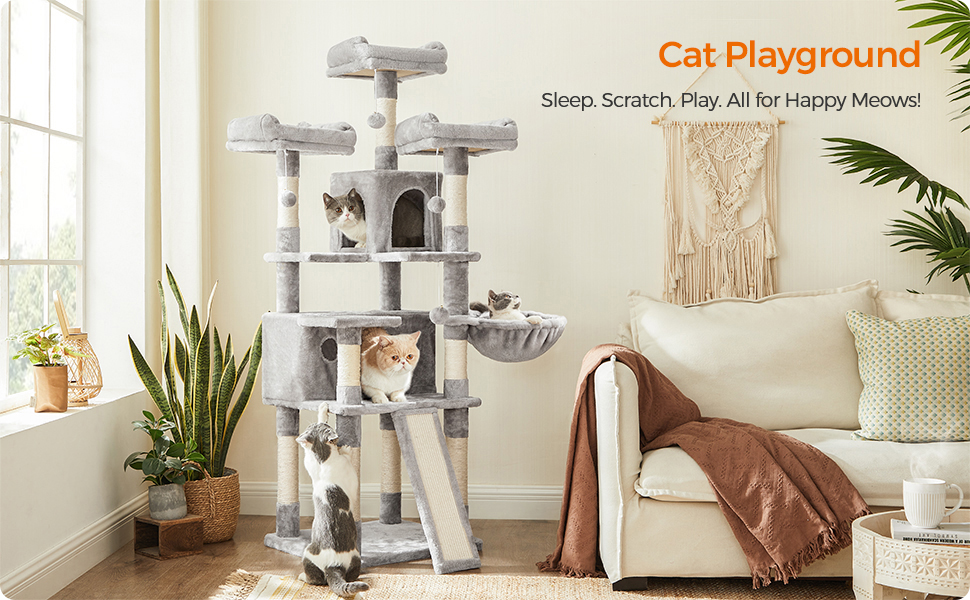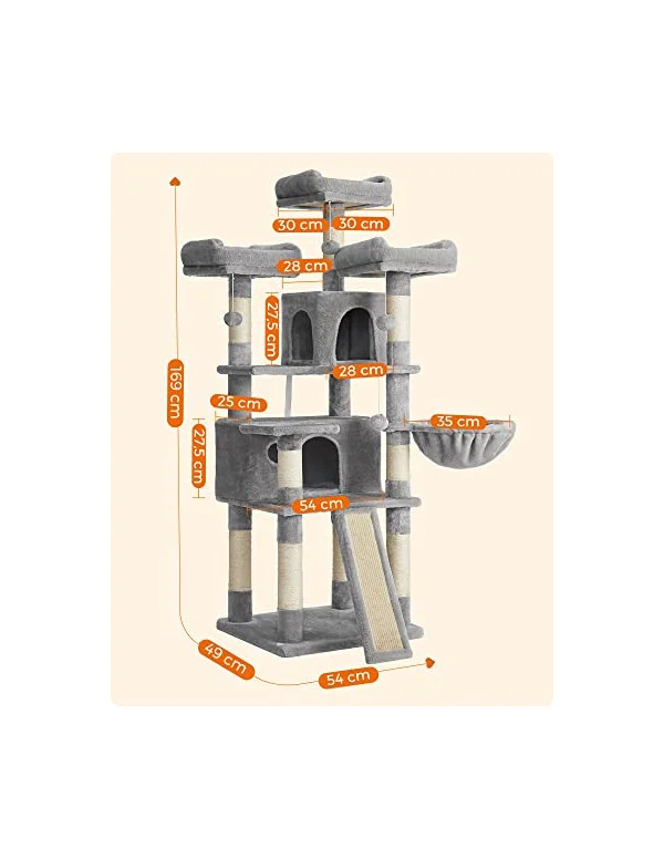 Specificatii: Culoare: Gri deschis Material: Placi aglomerate, tesatura plusata, sisal Dimensiunea produsului: 54 x 49 x 169 cm Greutatea produsului: 21 kg Despre acest articol Cu o structura in forma de scara, atat micutii pisoi cat si pisicile in varsta pot urca pe el ca niste profesionisti ai cataratului.3 platforme mari, 2 pesteri, 1 cosulet si 3 mingi de blana... atat de multe activitati! Cu o placa de baza intarita si un kit anti-inclinare, acest mobilier stabil este perfect pentru joaca. Datorita placii de zgariat mari si rezistente si a stalpilor de zgariat, acest ansamblu pentru pisici va prelungi considerabil durata de viata a canapelei si a tapetului dvs.