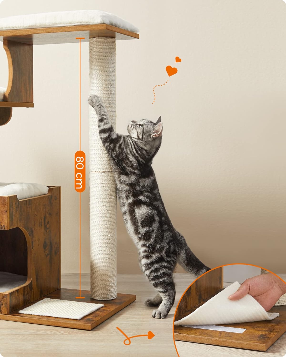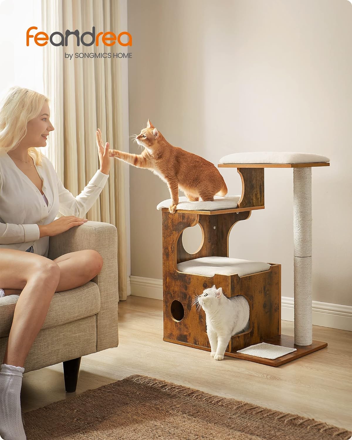 FEANDREA Ansamblu de joaca pentru pisici, tip mobilier, MDF, cu 3 culcusuri si ascunzatoare, 66x40x86cm, maro rustic Household NewTrend