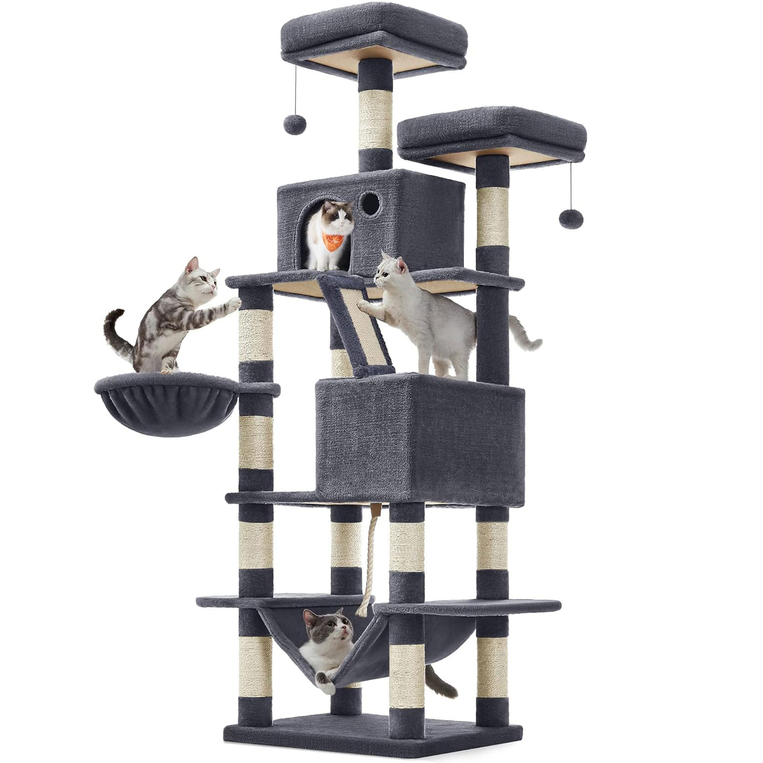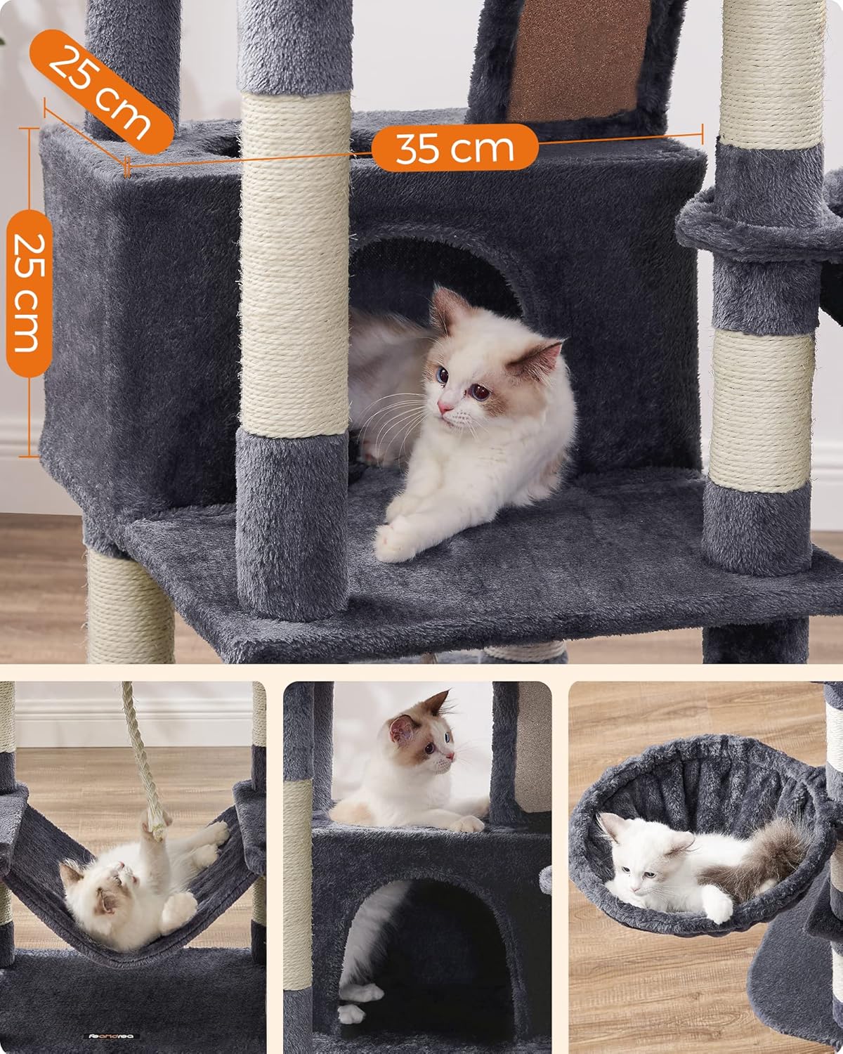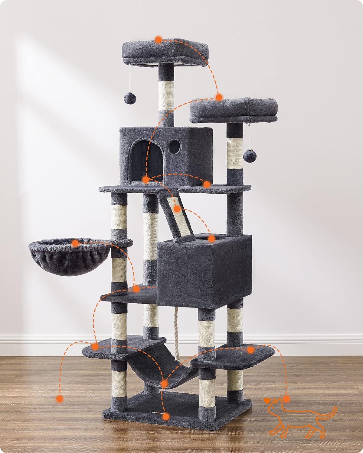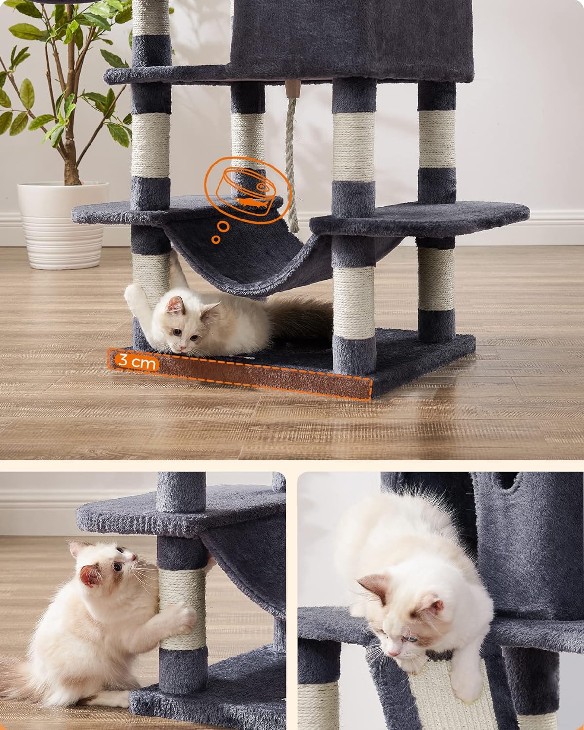 Ofera-le felinelor tale un spatiu complet pentru joaca, odihna si ascutirea ghearelor cu acest ansamblu de joaca pentru pisici FEANDREA. Cu design pe mai multe niveluri, 2 platforme inalte, 2 vizuini, 1 cos pufos, 1 hamac si mai multe suprafete de zgariat, acest copac pentru pisici XXL este ideal pentru locuinte cu una sau mai multe pisici. Structura stabila, baza ranforsata si sistemul anti-rasturnare ofera siguranta in utilizare, iar plusul moale adauga un plus de confort.