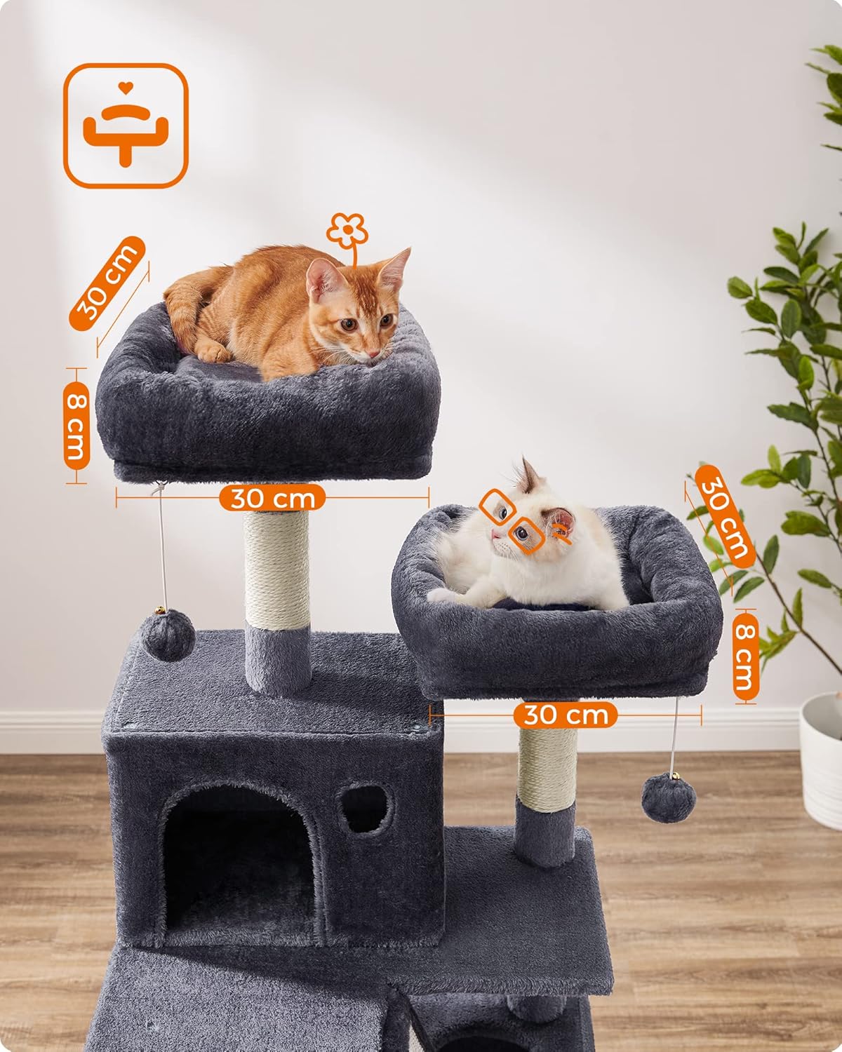Acest stalp de zgariat pentru pisici este gandit pentru a incuraja miscarea zilnica si pentru a proteja canapeaua si mobilierul. Distantele scurte dintre niveluri si rampa de catarare il fac potrivit atat pentru pisoi, cat si pentru pisici adulte sau mai in varsta. In plus, jucariile suspendate transforma fiecare zi intr-o sesiune distractiva de explorare.